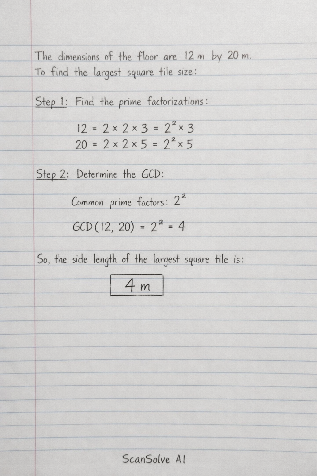 Step 1: Find the prime factorization of each dimension.