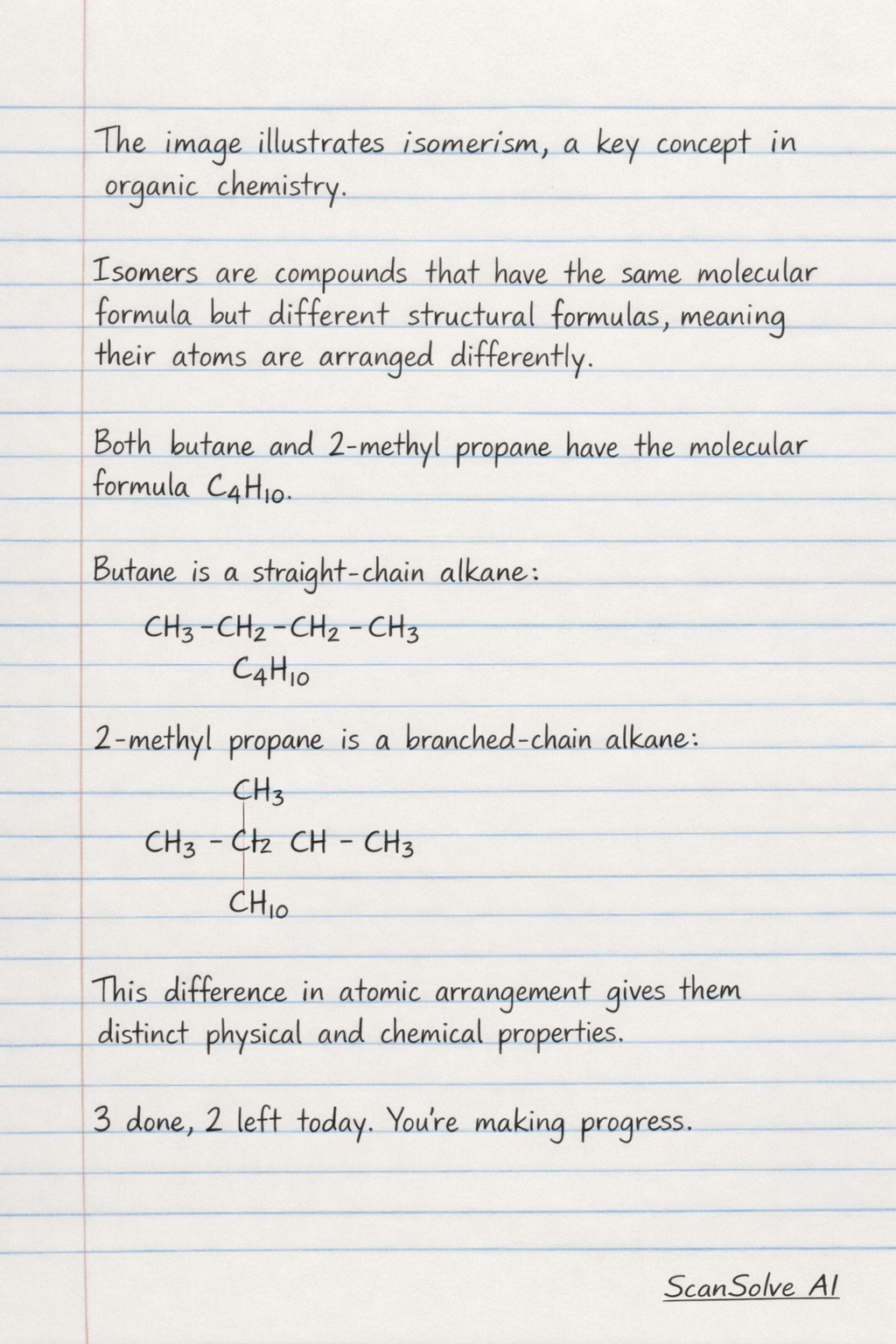 Isomers are compounds that have the same molecular formula but different structural formulas, meaning their atoms are arranged differently. Both butane and 2-methyl propane have the molecular formula C4H10. Butane is a straight-chain alkane, while 2-methyl propane is a branched-chain alkane. This difference in atomic arrangement gives them distinct physical and chemical properties.