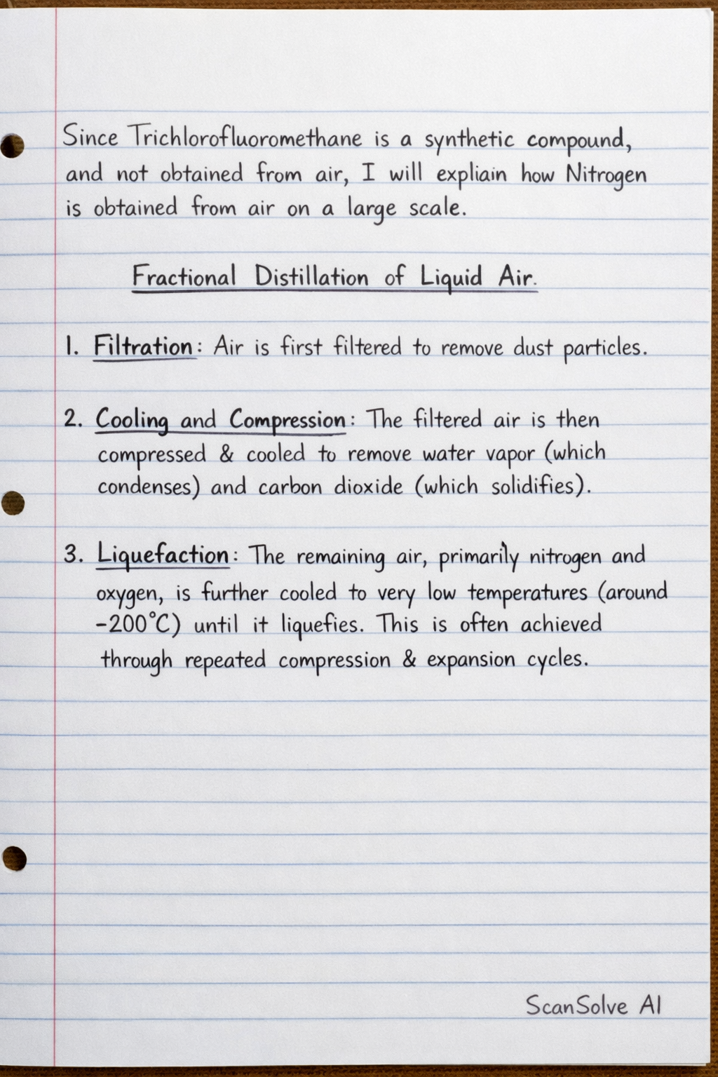 The question appears to have a slight error, as Trichlorofluoromethane is a synthetic compound and not obtained from air. Assuming the question intends to ask about how Nitrogen is obtained from air on a large scale, the process is fractional distillation of liquid air.