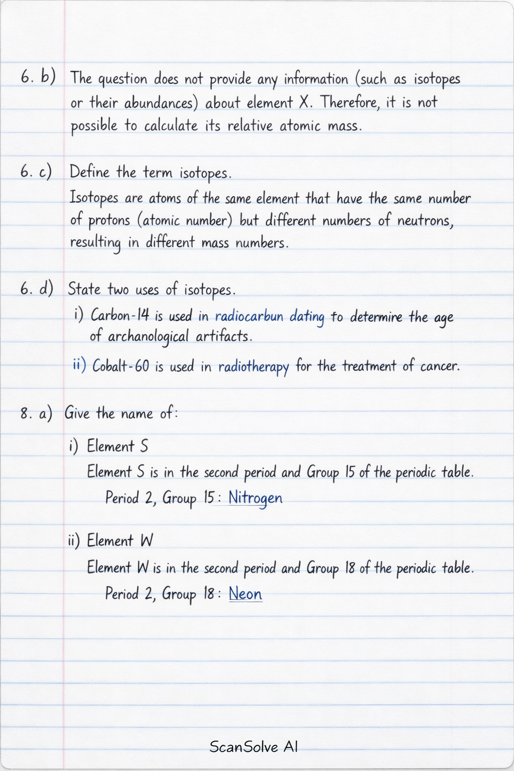 6. c) Define the term isotopes. Isotopes are atoms of the same element that have the same number of protons (atomic number) but different numbers of neutrons, resulting in different mass numbers.