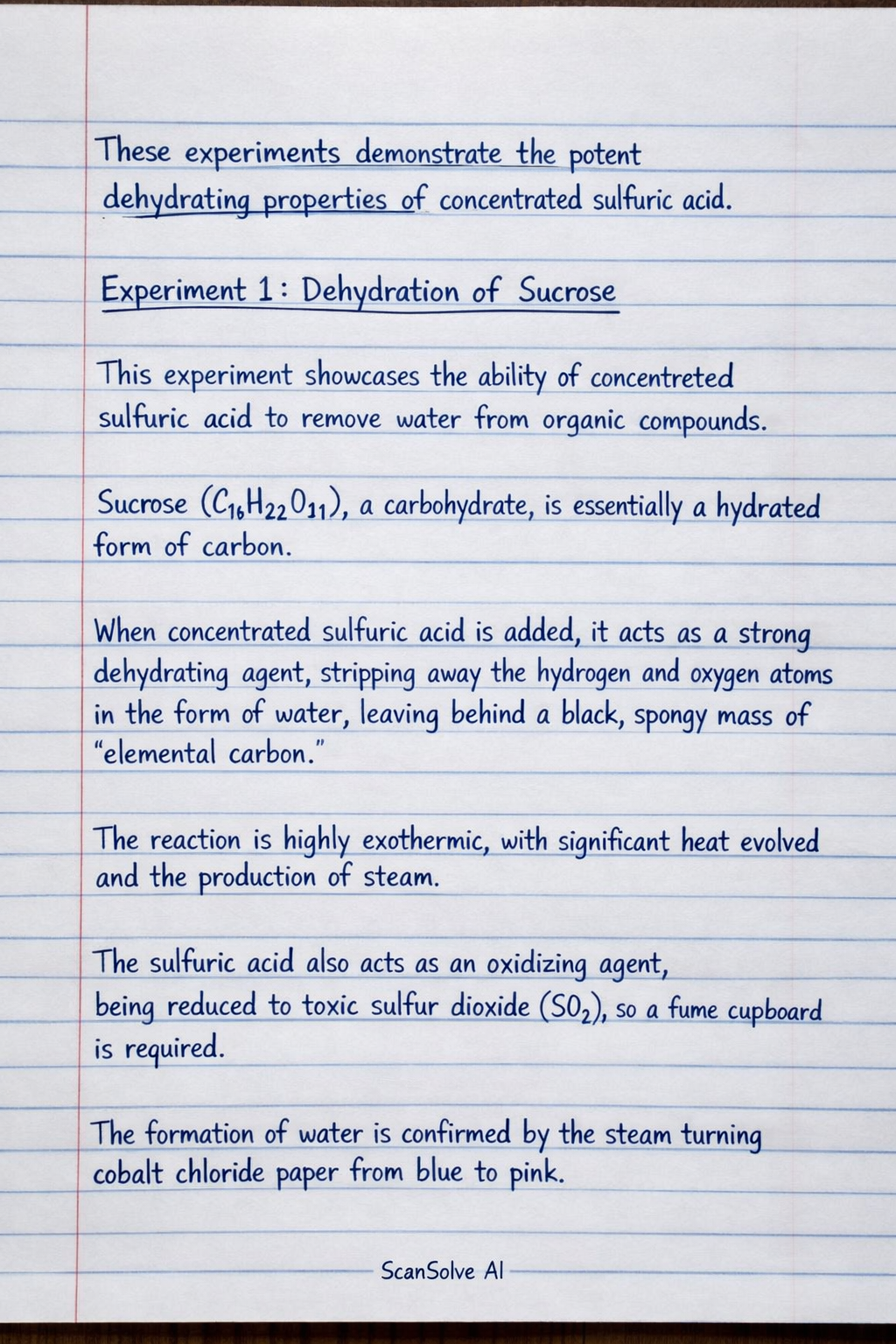 Both experiments highlight the corrosive and hazardous nature of concentrated sulfuric acid, emphasizing the critical need for eye protection and working in a fume cupboard due to the evolution of toxic gases and heat. The principle of adding acid to water, not water to acid, is also a crucial safety consideration when diluting concentrated acids.