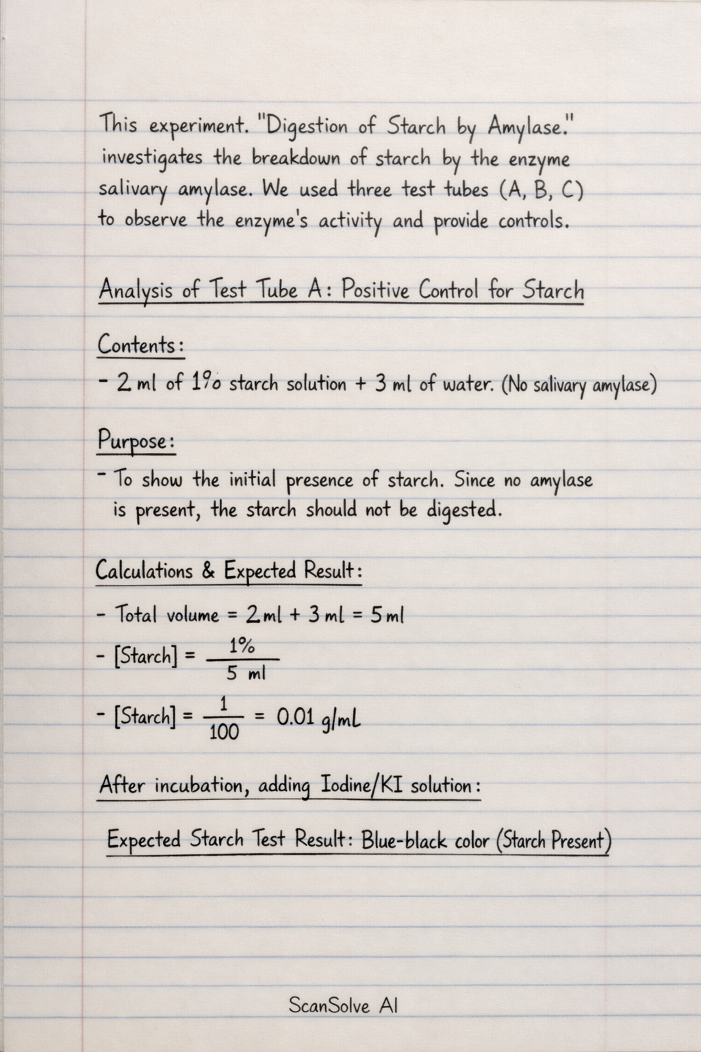 - Expected Starch Test Result: After incubation at 37°C for 10 minutes, the salivary amylase should have digested most, if not all, of the starch. Therefore, adding Iodine/KI solution will result in a yellowish-brown color, indicating the absence or significant reduction of starch. If digestion is incomplete, a reddish-brown or lighter blue color might be observed.