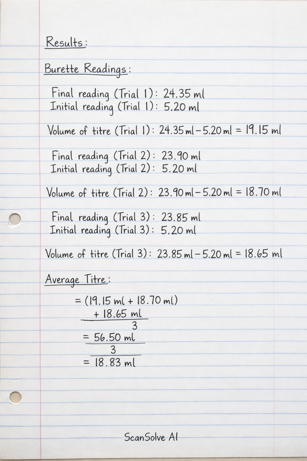 - Average titre (ml): You calculate this by summing the consistent volumes of titre (usually the second and third readings if they are close, or all if they are consistent) and dividing by the number of readings used.