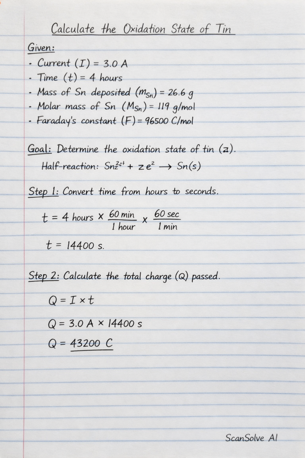 From the half-reaction Snz++ze−→Sn(s), we know that z moles of electrons are required to deposit 1 mole of tin. Therefore, the ratio of moles of electrons to moles of tin gives the oxidation state.