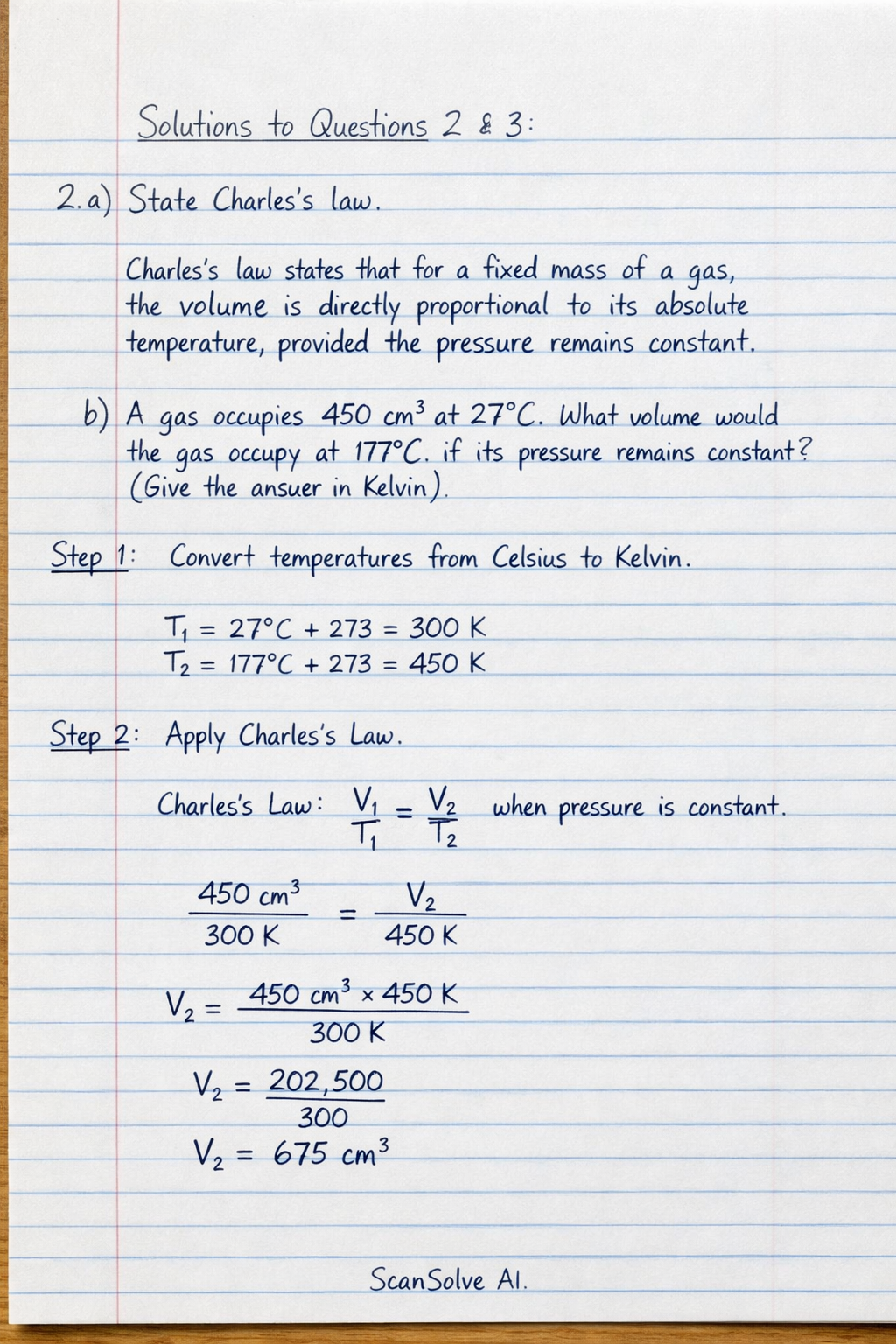 b) A gas occupies at . What volume would the gas occupy at ? If its pressure remains constant? (Give the answer in Kelvin)