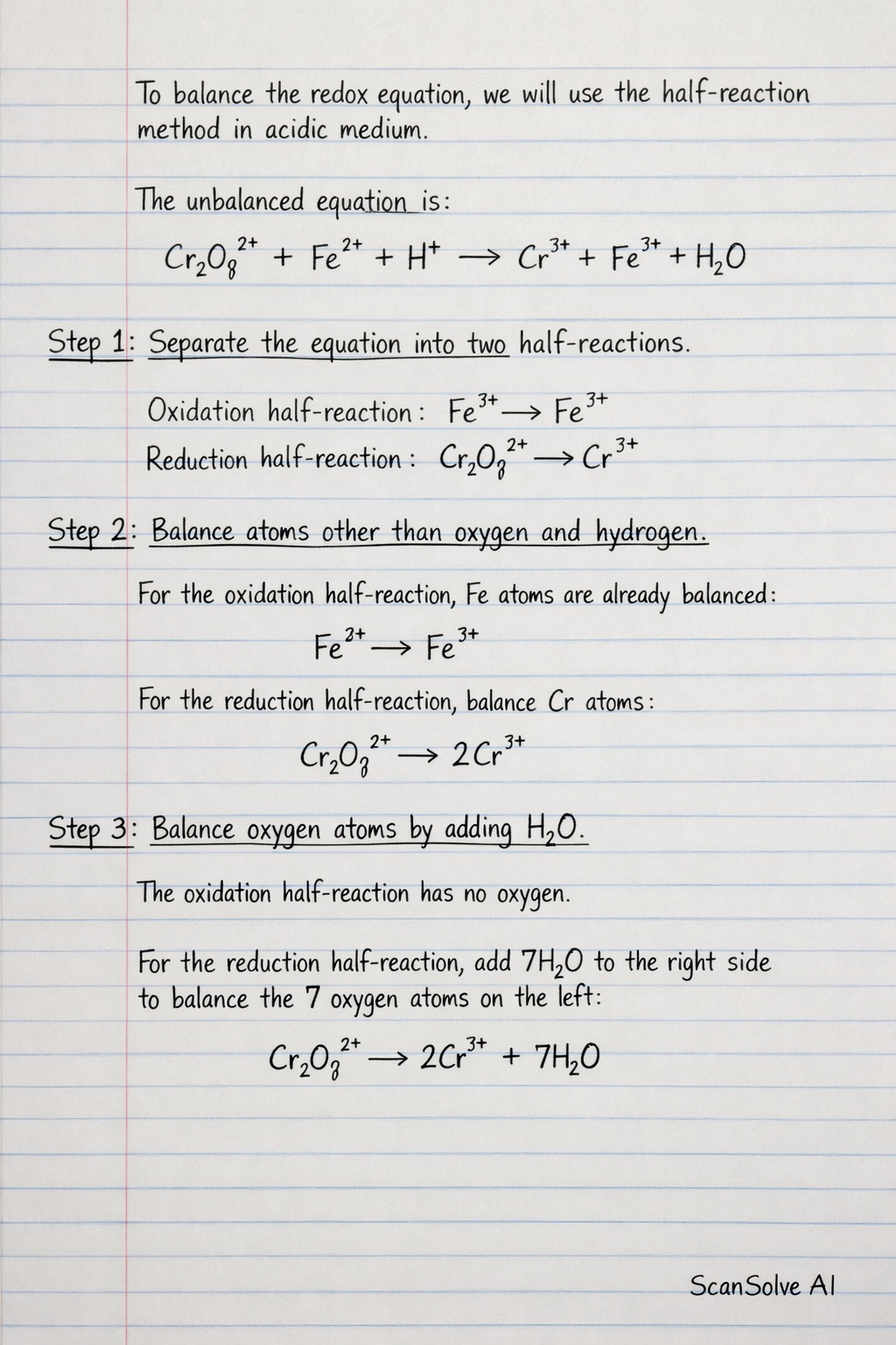 For the reduction half-reaction, balance Cr atoms: