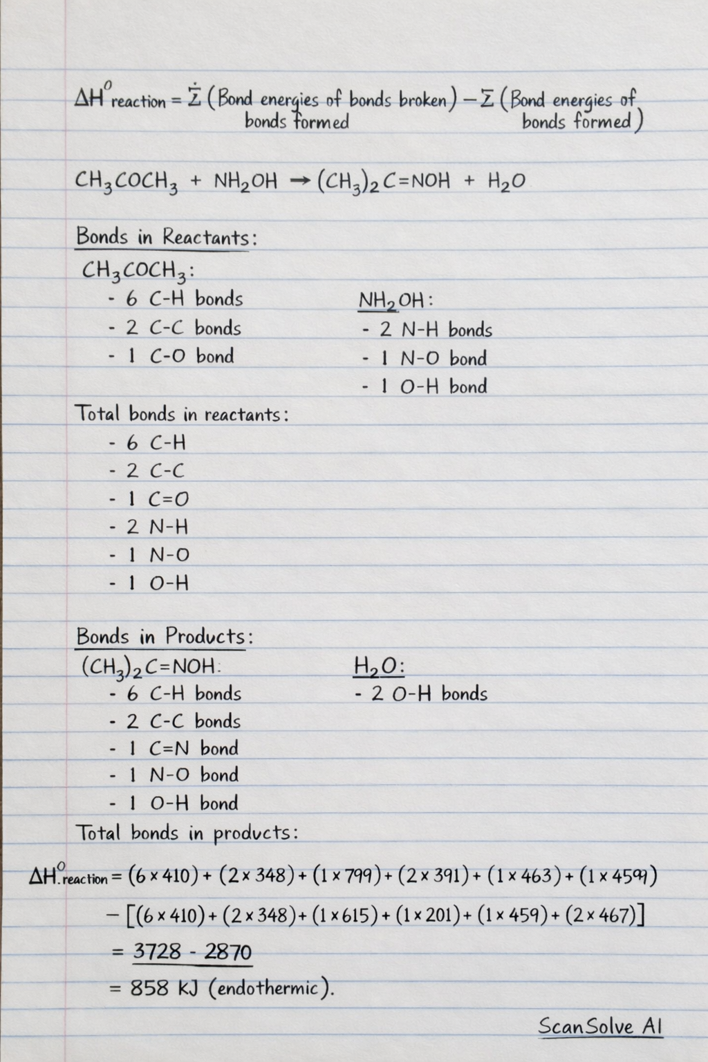 ΔHreaction∘=∑(Bondenergiesofbondsbroken)−∑(Bondenergiesofbondsformed)