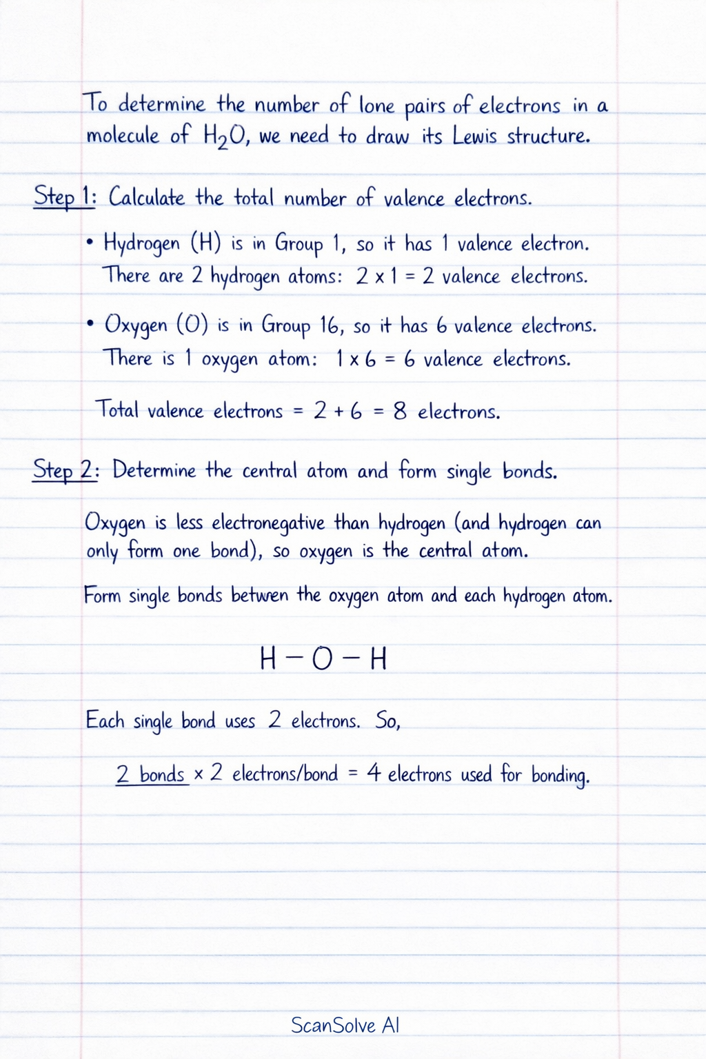 Step 2: Determine the central atom and form single bonds. Oxygen is less electronegative than hydrogen (and hydrogen can only form one bond), so oxygen is the central atom. Form single bonds between the oxygen atom and each hydrogen atom. Each single bond uses 2 electrons. So, electrons used for bonding.