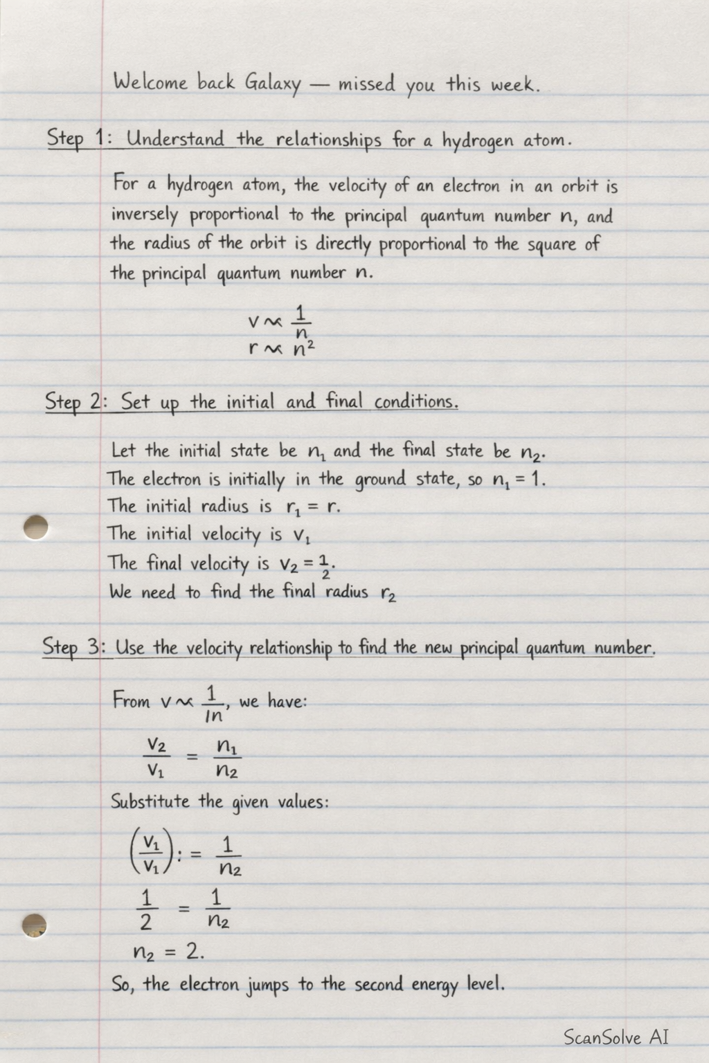 Step 3: Use the velocity relationship to find the new principal quantum number. From , we have: Substitute the given values: So, the electron jumps to the second energy level.
