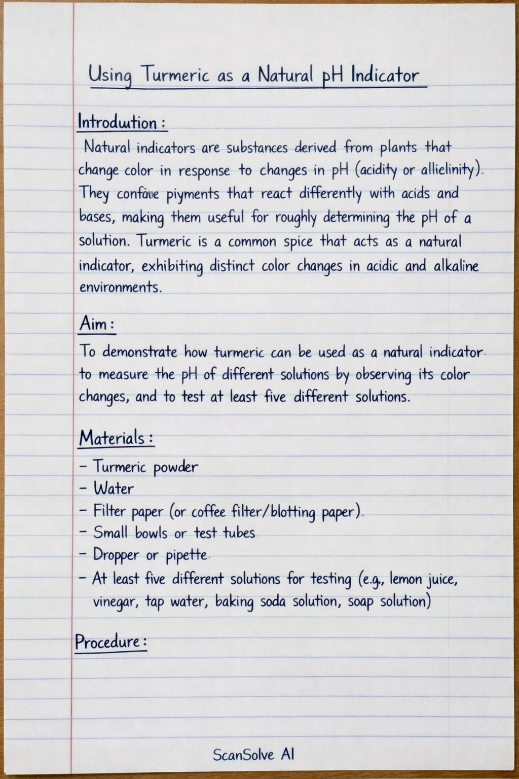 Aim: To demonstrate how turmeric can be used as a natural indicator to measure the pH of different solutions by observing its color changes, and to test at least five different solutions.