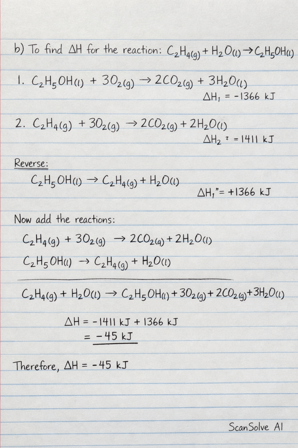 We are also asked in the question to determine the enthalpy change when 30.8g of ethanol is produced from the reaction below. C2H4 + H2O-----C2H5OH. The RMM of ethanol is 46