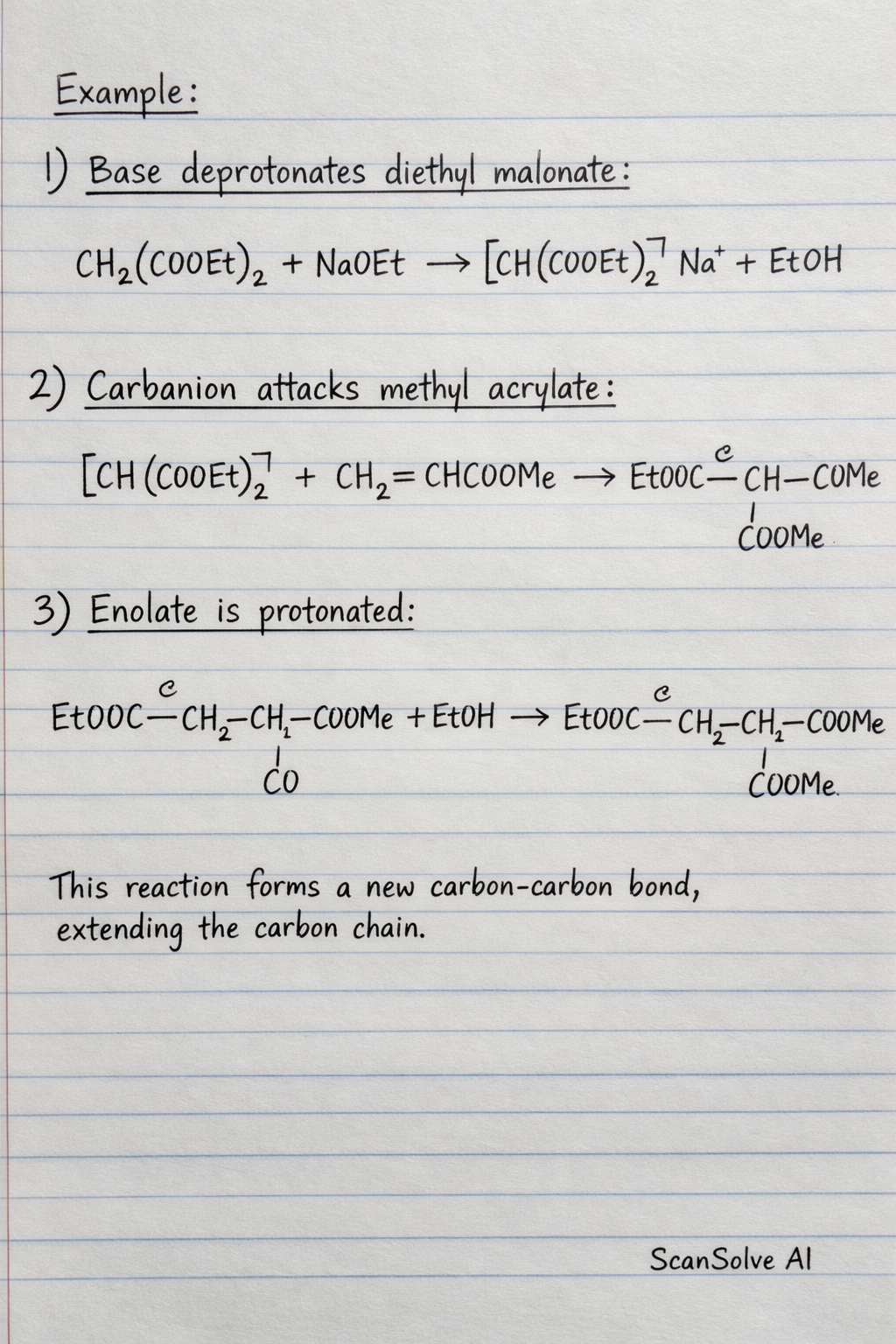 Consider the reaction between diethyl malonate (a nucleophile) and methyl acrylate (an α,β-unsaturated carbonyl compound) in the presence of a base like sodium ethoxide.