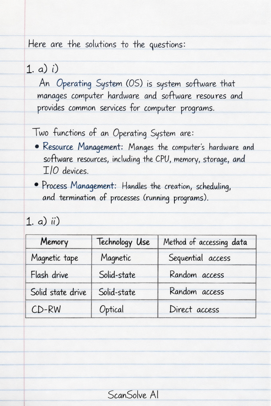 1. a) i) An Operating System (OS) is system software that manages computer hardware and software resources and provides common services for computer programs.