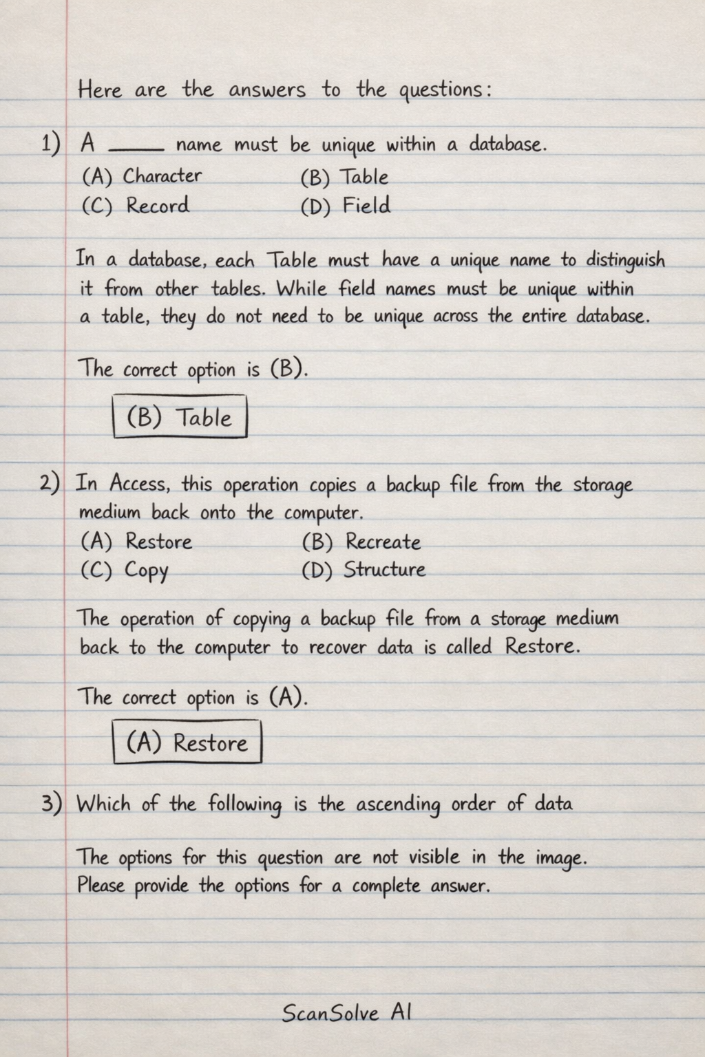 2) In Access, this operation copies a backup file from the storage medium back onto the computer (A) Restore (B) Recreate (C) Copy (D) Structure