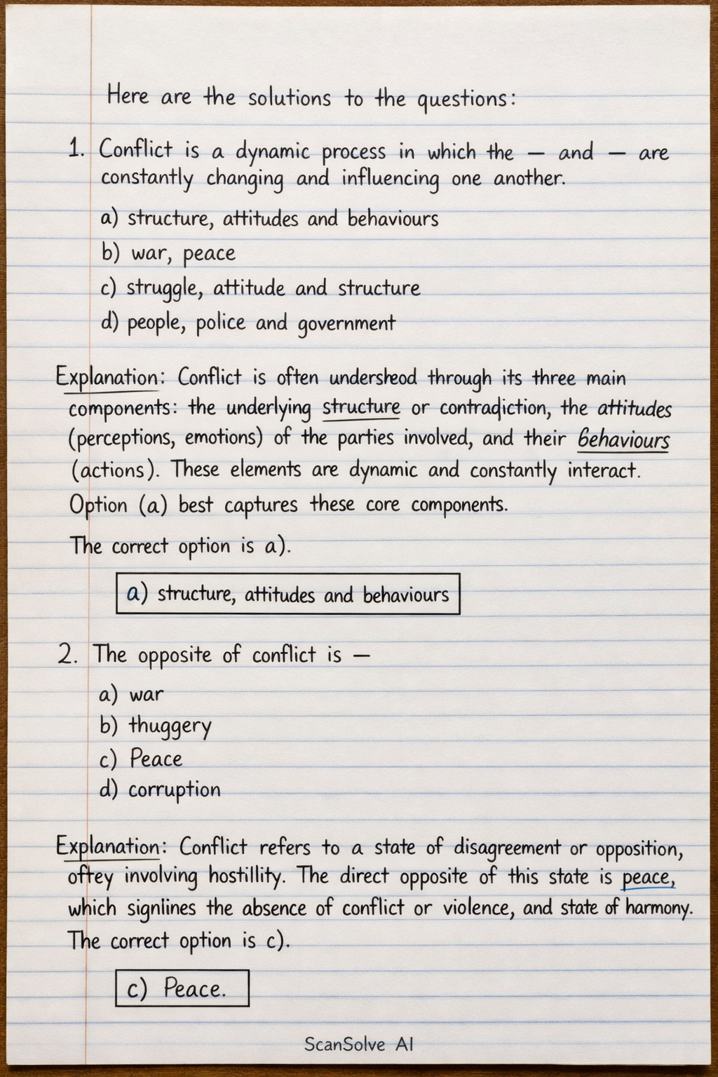 Explanation: Conflict is often understood through its three main components: the underlying structure or contradiction, the attitudes (perceptions, emotions) of the parties involved, and their behaviours (actions). These elements are dynamic and constantly interact. Option (a) best captures these core components.