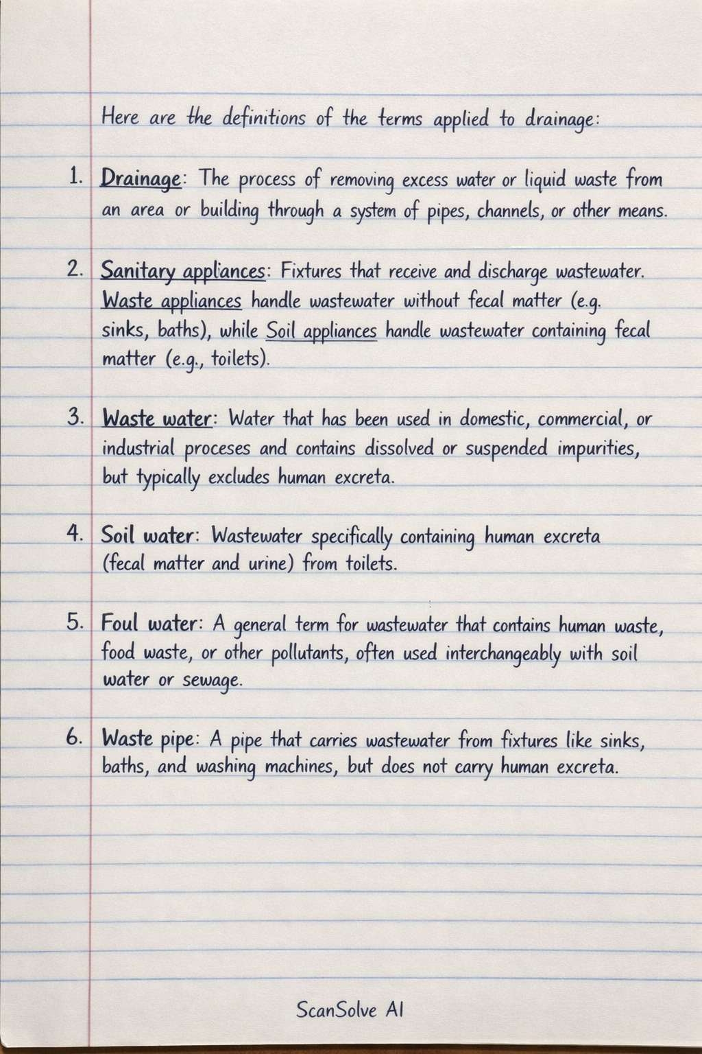 6. Waste pipe: A pipe that carries wastewater from fixtures like sinks, baths, and washing machines, but does not carry human excreta.