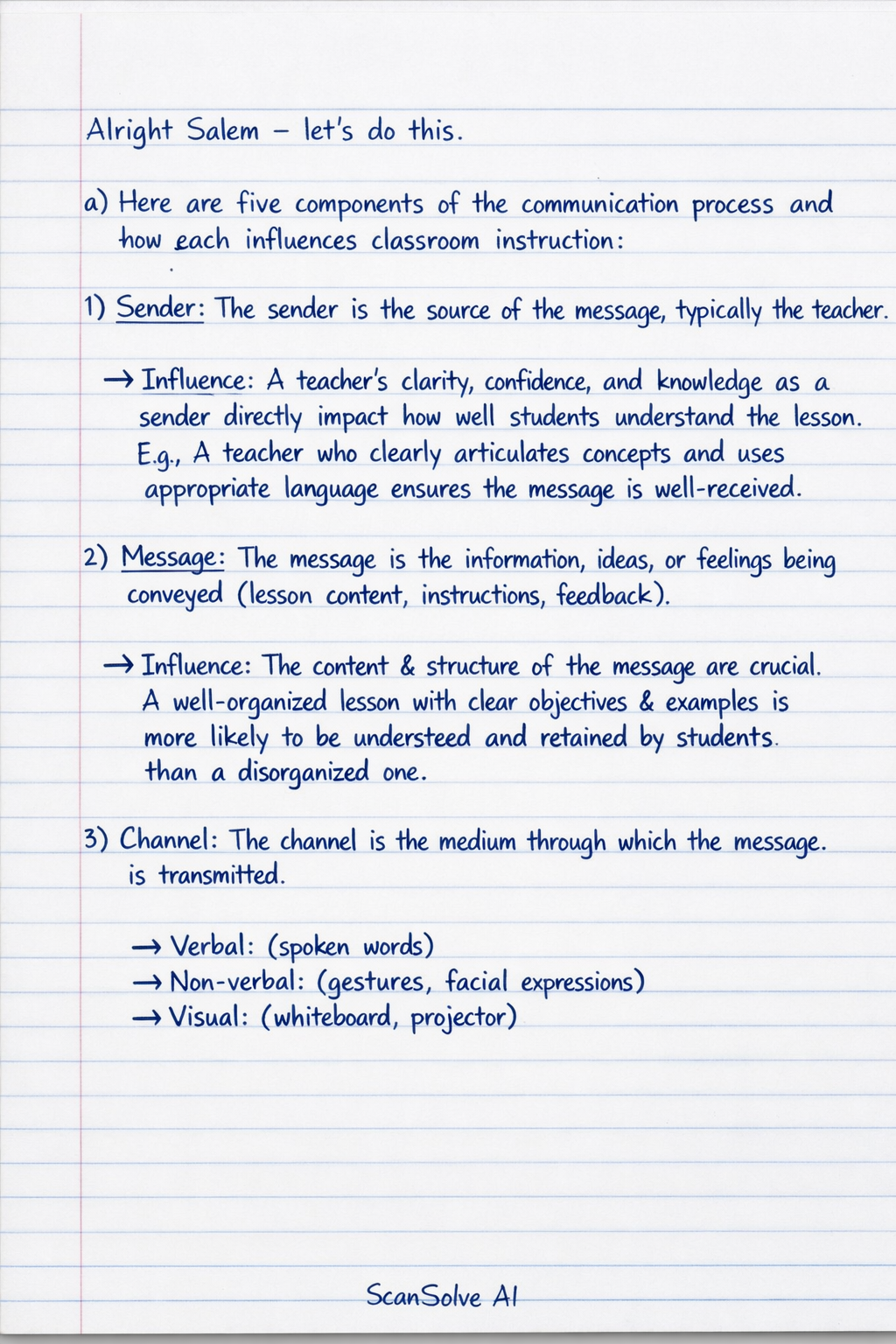 Alright Salem — let's do this. a) Here are five components of the communication process and how each influences classroom instruction: Sender: The sender is the source of the message, typically the teacher in a classroom. Influence:* A teacher's clarity, confidence, and knowledge as a sender directly impact how well students understand the lesson. For example, a teacher who clearly articulates concepts and uses appropriate language ensures the message is well-received. Message: The message is the information, ideas, or feelings being conveyed. In a classroom, this is the lesson content, instructions, or feedback. Influence:* The content and structure of the message are crucial. A well-organized lesson with clear objectives and relevant examples (the message) is more likely to be understood and retained by students than a disorganized one. Channel: The channel is the medium through which the message is transmitted. This can be verbal (spoken words), non-verbal (gestures, facial expressions), or visual (whiteboard, projector). Influence:* Choosing the right channel enhances learning. For instance, explaining a complex math problem verbally while simultaneously writing steps on the whiteboard (using both auditory and visual channels) helps students grasp the concept more effectively. Receiver: The receiver is the person or group who receives and interprets the message, which are the students in a classroom setting. Influence:* Students' prior knowledge, attention span, and learning styles as receivers influence how they decode the message. A teacher might need to rephrase instructions if students appear confused, indicating they haven't effectively received the initial message. Feedback: Feedback is the receiver's response to the message, indicating whether the message was understood. In a classroom, this could be student questions, nods, or completed assignments. Influence:* Feedback allows the teacher to assess comprehension and adjust instruction. When students ask clarifying questions or correctly answer a pop quiz, it provides feedback that the lesson (message) was effectively communicated, or highlights areas needing further explanation. b) Here are five interactions between verbal and non-verbal communication during instruction: Repeating: Non-verbal cues reiterate or reinforce the verbal message. Example: A teacher verbally says, "Please come forward," while simultaneously gesturing with their hand* for students to move closer. The gesture repeats the verbal instruction. Contradicting: Non-verbal cues send a message that is opposite to the verbal message. Example: A teacher verbally says, "I'm not upset at all," but their arms are crossed tightly and their brow is furrowed*. The non-verbal cues contradict the verbal statement, suggesting they are indeed upset. Substituting: Non-verbal cues replace verbal messages entirely. Example: A teacher shakes their head* to indicate "no" when a student asks if they can leave early, without saying a word. The head shake substitutes a verbal refusal. Complementing: Non-verbal cues add depth, emotion, or further meaning to the verbal message. Example: A teacher explains the importance of a historical event with a serious tone and solemn facial expression*, complementing the gravity of the verbal information. Accenting/Regulating: Non-verbal cues emphasize certain parts of the verbal message or control the flow of conversation. Example: A teacher pauses and makes eye contact before delivering a key point in a lecture, or raises their voice slightly* to emphasize a crucial instruction. This accents the verbal message. Send me the next one 📸