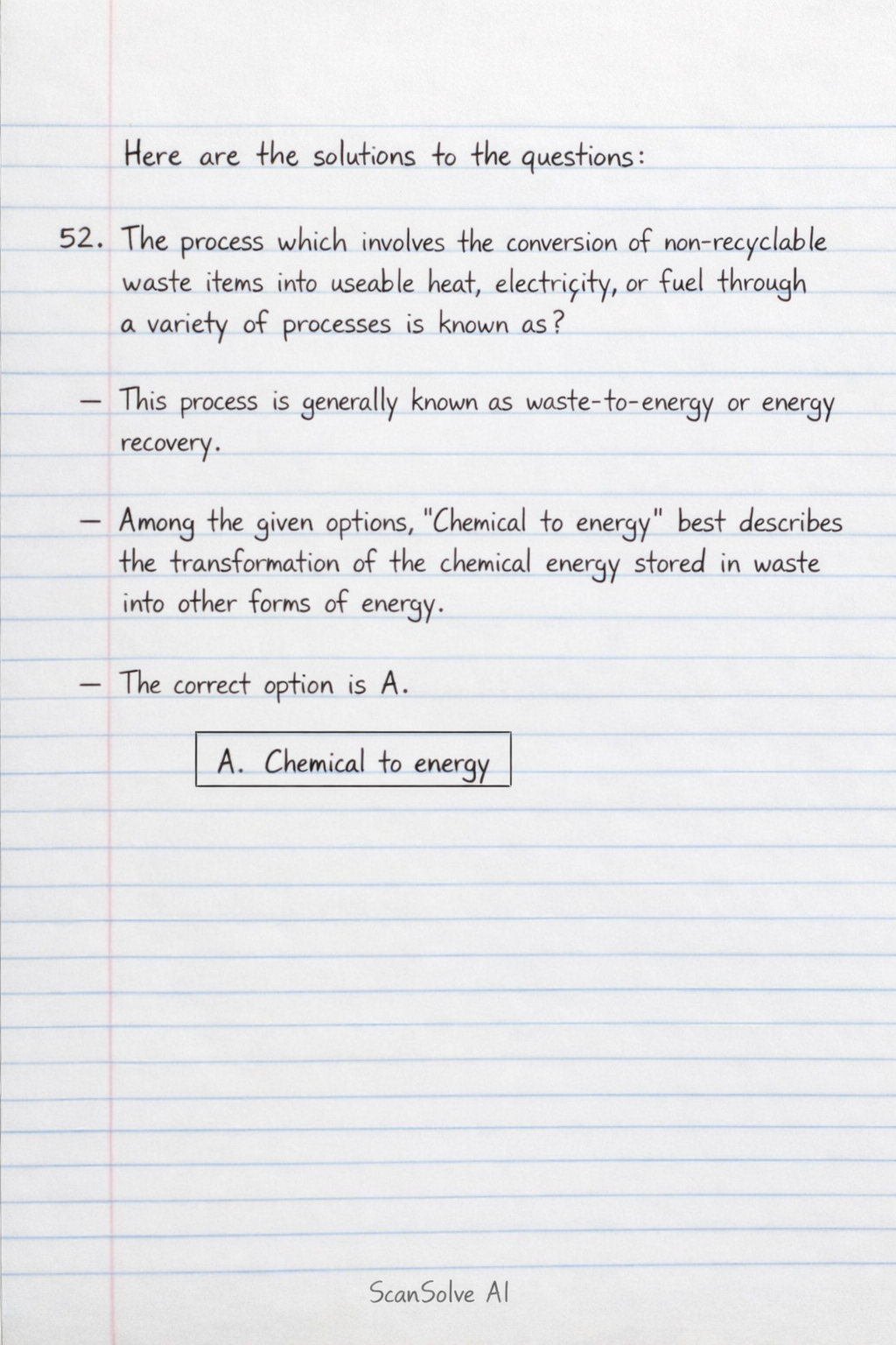 - This process is generally known as waste-to-energy or energy recovery. Among the given options, "Chemical to energy" best describes the transformation of the chemical energy stored in waste into other forms of energy.