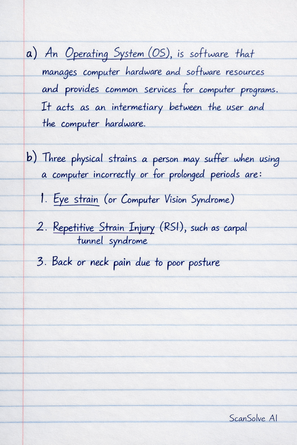 a) An Operating System (OS) is software that manages computer hardware and software resources and provides common services for computer programs. It acts as an intermediary between the user and th
