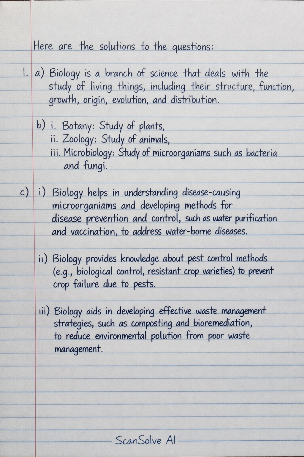 c) i) Biology helps in understanding disease-causing microorganisms and developing methods for disease prevention and control, such as water purification and vaccination, to address water-borne diseases. ii) Biology provides knowledge about pest control methods (e.g., biological control, resistant crop varieties) to prevent crop failure due to pests. iii) Biology aids in developing effective waste management strategies, such as composting and bioremediation, to reduce environmental pollution from poor waste management.
