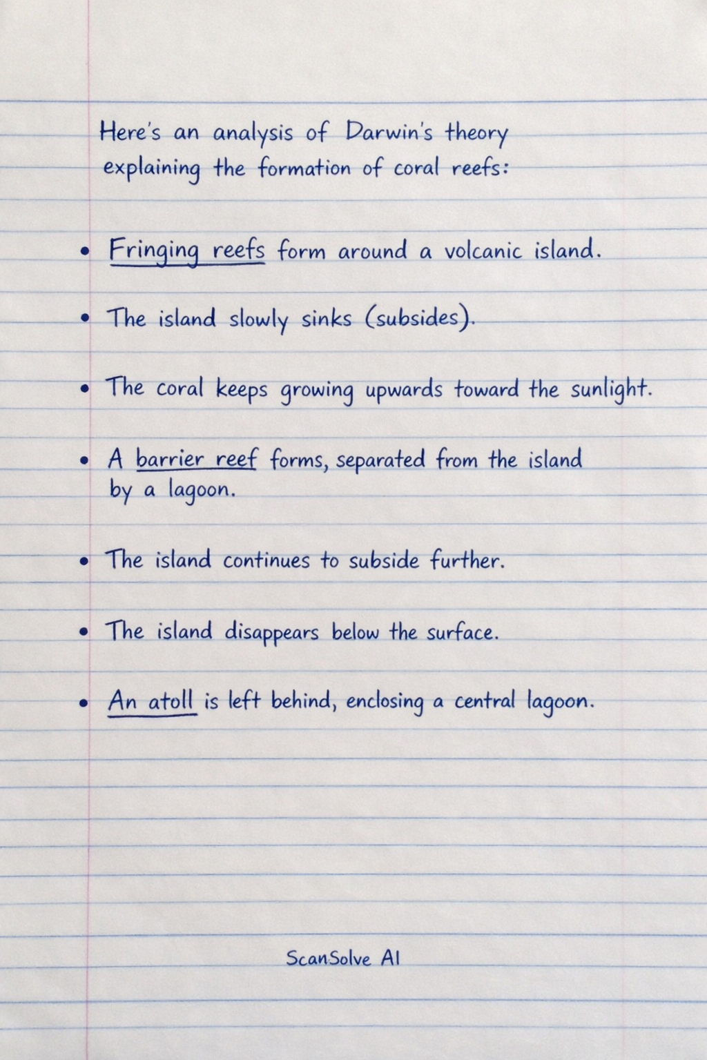 a) Darwin's theory explains the formation of coral reefs, which are the underwater rock-like structures, through a process of subsidence. It proposes that reefs begin as fringing reefs growing around a volcanic island. As the island slowly sinks (subsides), the coral continues to grow upwards towards the sunlight, forming a barrier reef separated from the island by a lagoon. With continued subsidence, the island eventually disappears below the surface, leaving a ring-shaped atoll enclosing a central lagoon.