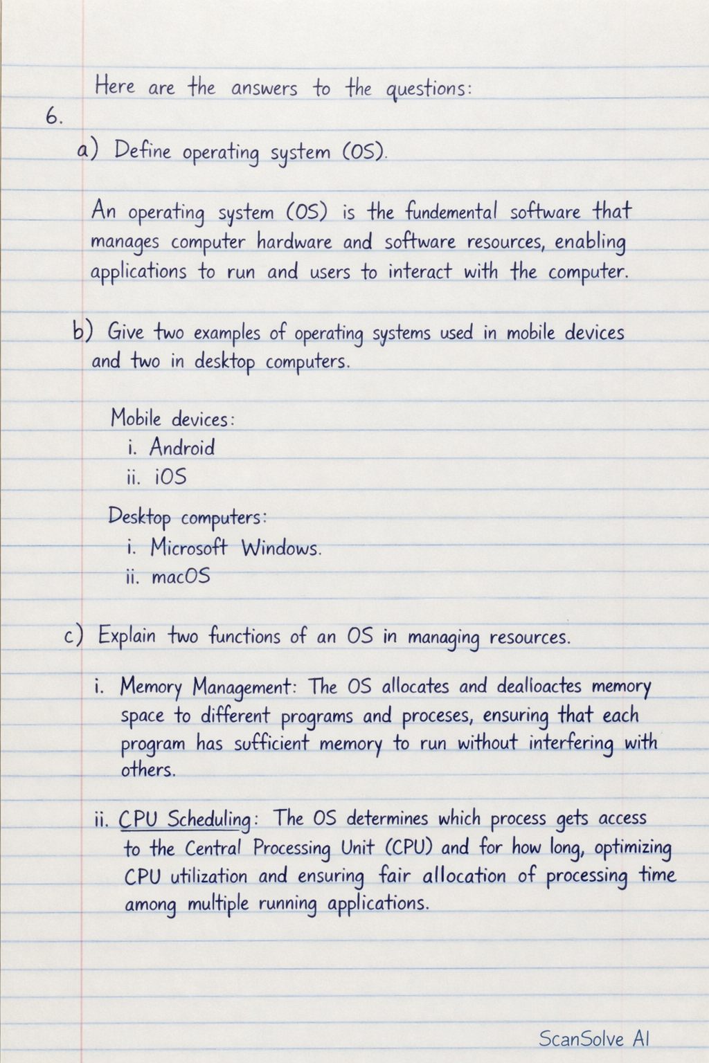 6. a) Define operating system (OS).* An operating system (OS) is the fundamental software that manages computer hardware and software resources, enabling applications to run and users to interact with the computer.