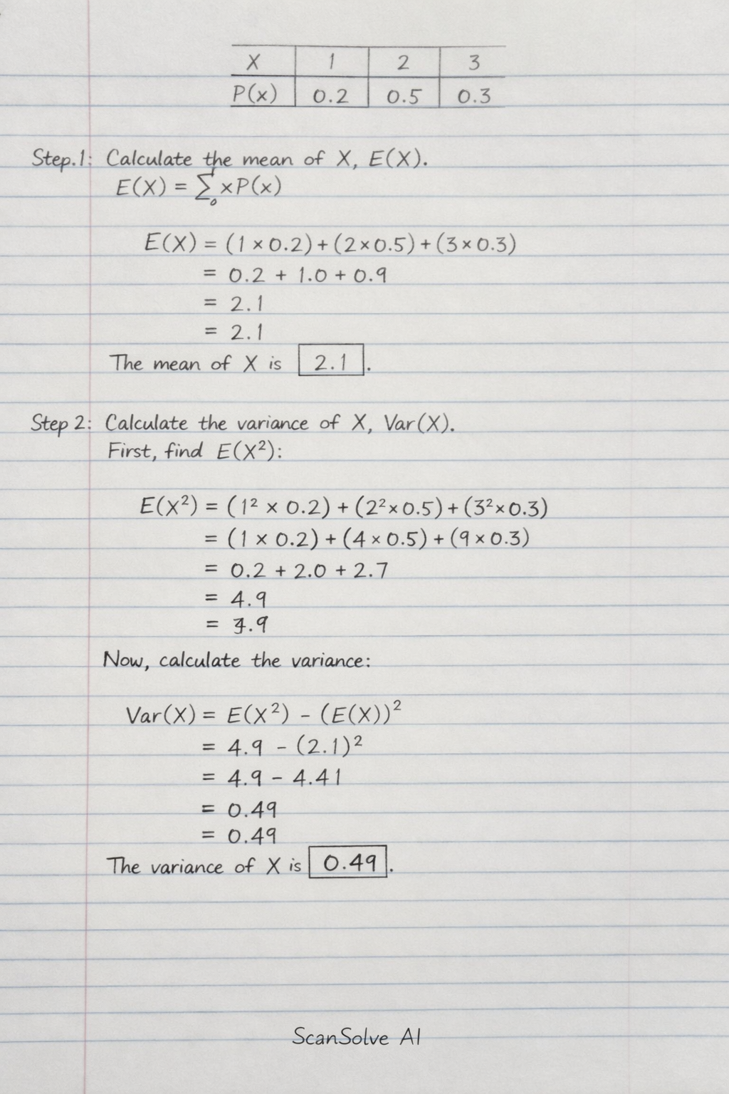 E(X)=(1×0.2)+(2×0.5)+(3×0.3)=0.2+1.0+0.9=2.1