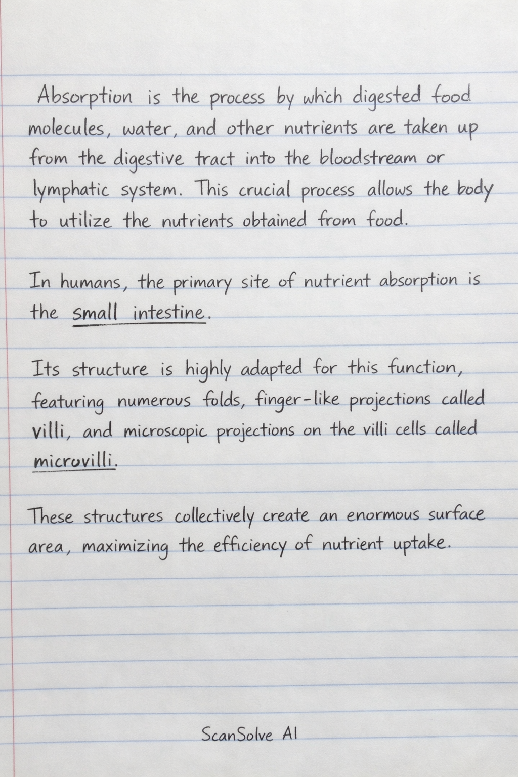 In humans, the primary site of nutrient absorption is the small intestine. Its structure is highly adapted for this function, featuring numerous folds, finger-like projections called villi, and microscopic projections on the villi cells called microvilli. These structures collectively create an enormous surface area, maximizing the efficiency of nutrient uptake.