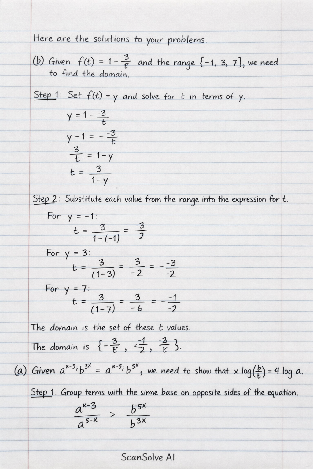 b) Given the function f(t)=1−t3 and the range {−1,3,7}, we need to find the domain.