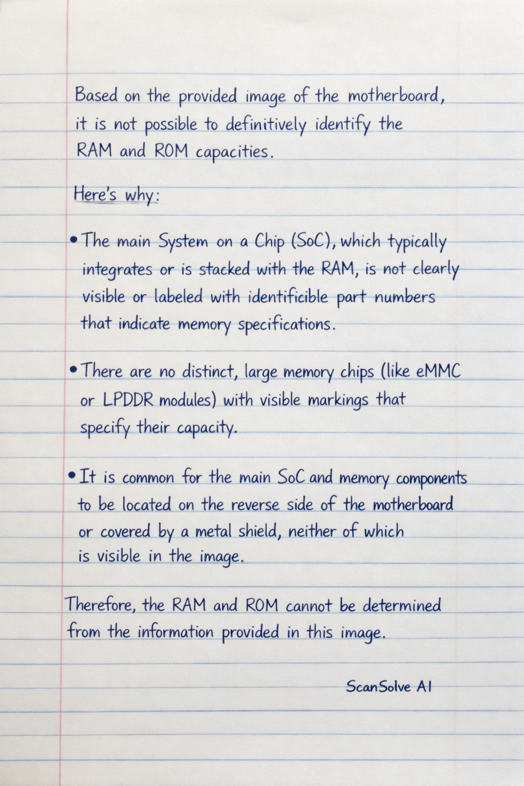 There are no distinct, large memory chips (like eMMC or LPDDR modules) with visible markings that specify their capacity.