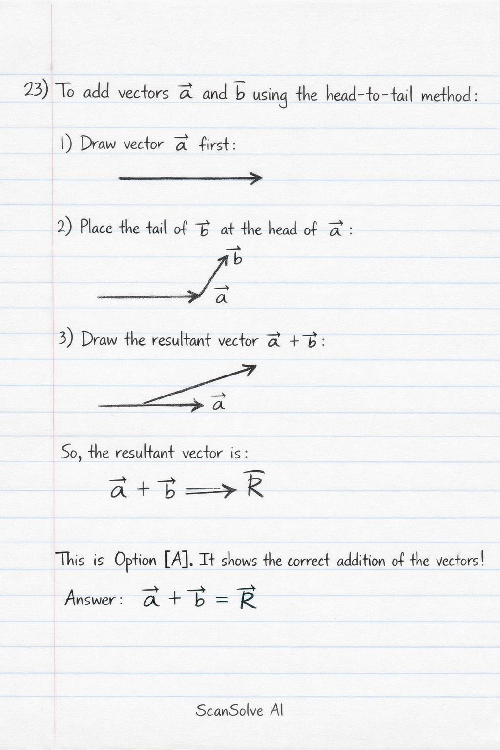 To add vectors and using the head-to-tail method, you place the tail of the second vector () at the head of the first vector (). The resultant vector is then drawn from the tail of the first vector () to the head of the second vector ().