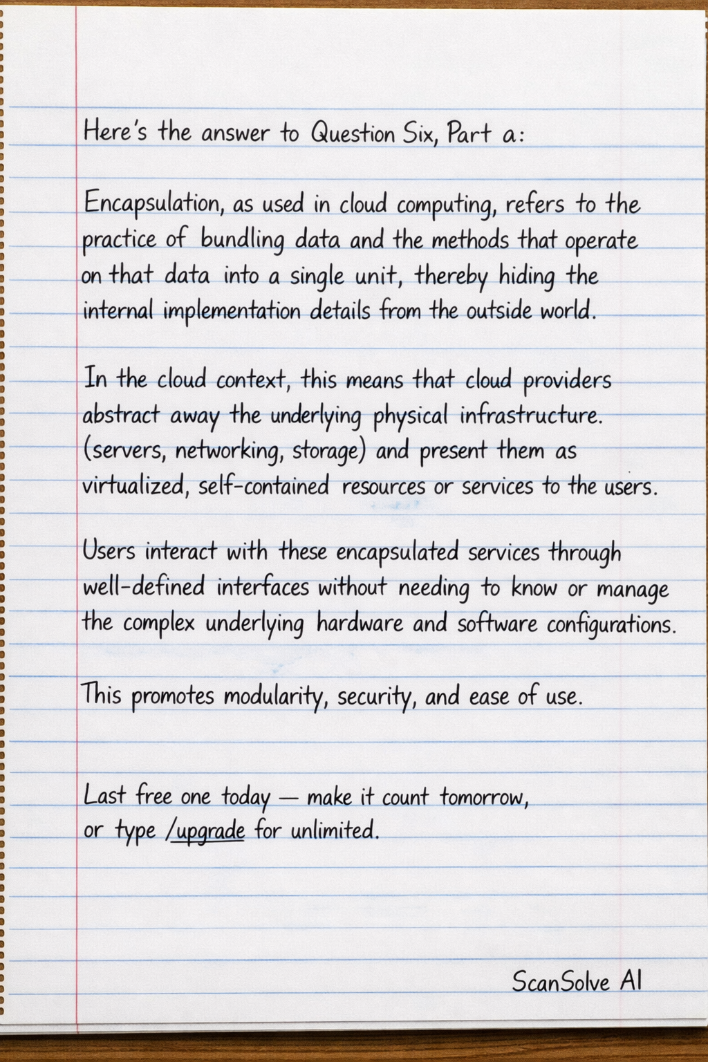 Here's the answer to Question Six, Part a: Encapsulation, as used in cloud computing, refers to the practice of bundling data and the methods that operate on that data into a single unit, thereby hiding the internal implementation details from the out…