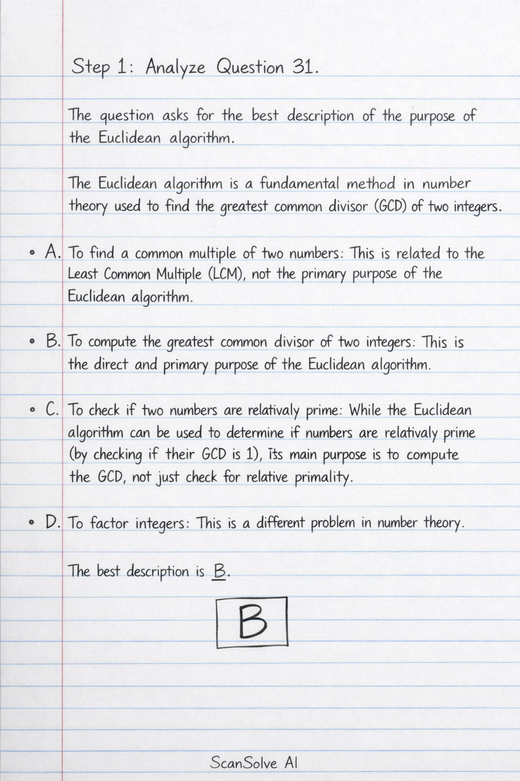 Step 2: Analyze Question 32. Given and , we need to find the first step in applying the Euclidean algorithm. The Euclidean algorithm starts by dividing the larger number by the smaller number and finding the remainder. In this case, is larger than . So, the first step is to divide by . where is the quotient and is the remainder.