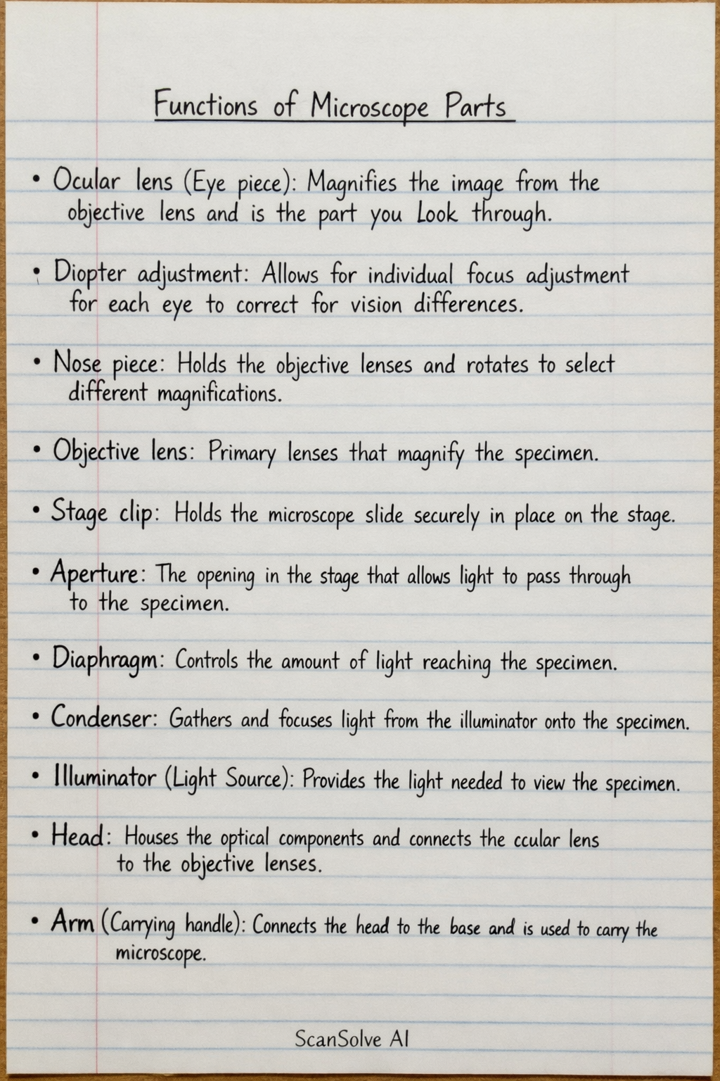 Here are the functions of the labeled parts of the microscope: