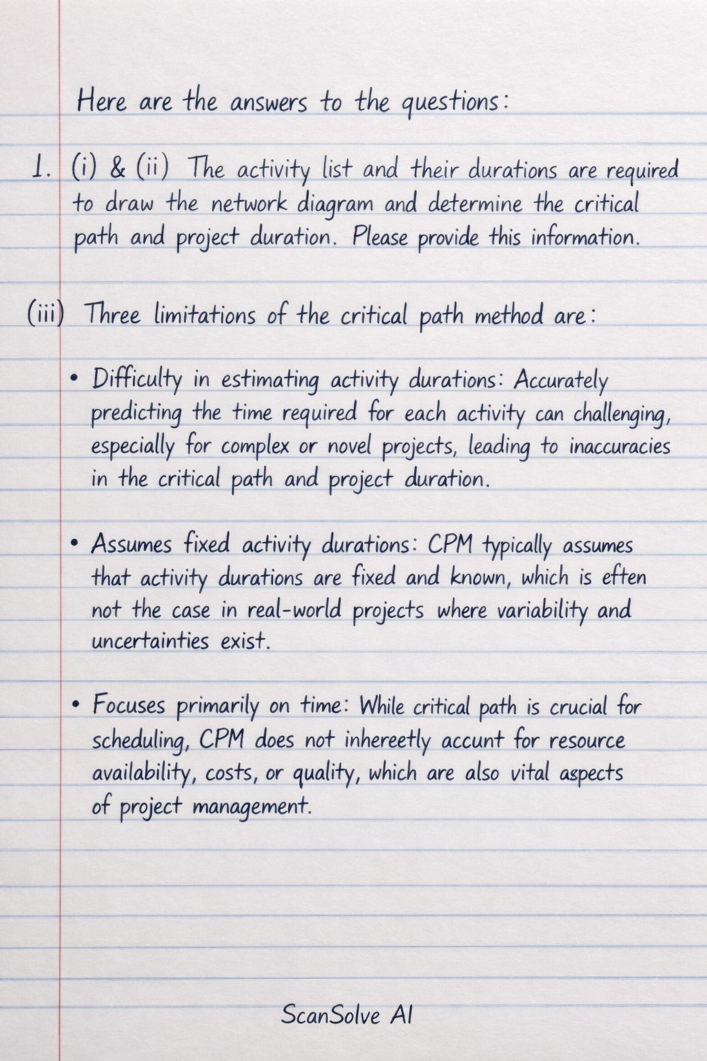(iii) Three limitations of the critical path method are: