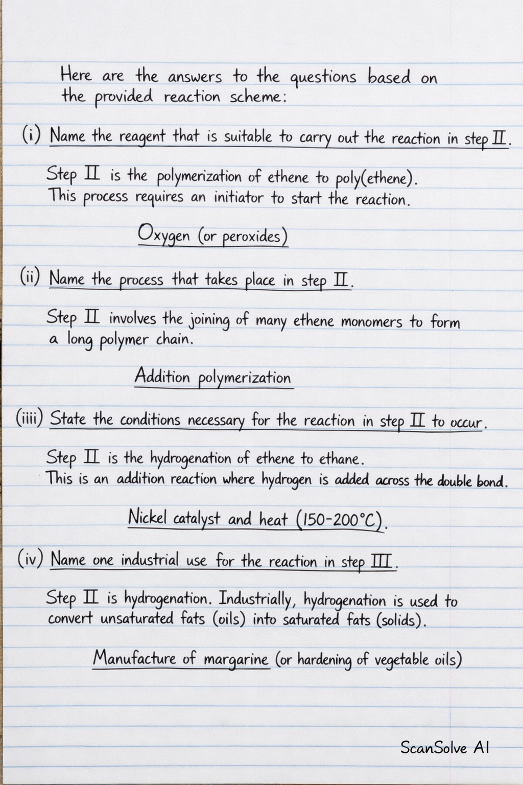 b. Study the scheme diagram below and answer the questions that follow: (i) Name the reagent that is suitable to carry out the reaction in step (ii) Name the process that takes place in step II. (iii) State the conditions necessary for the reaction in step III to occur. (iv) Name one industrial use for the reaction in step III. (v) Write down the equation for the reaction that takes place in step IV.