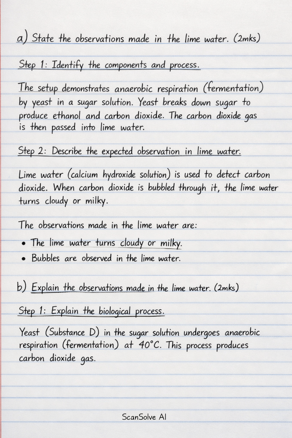 Step 2: Describe the expected observation in lime water. Lime water (calcium hydroxide solution) is used to detect carbon dioxide. When carbon dioxide is bubbled through it, the lime water turns cloudy or milky.