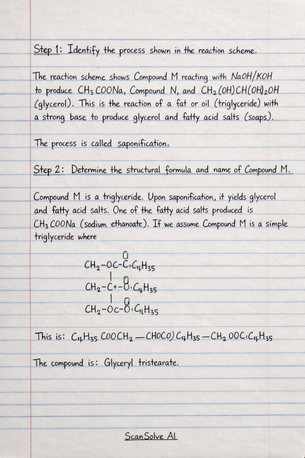 Step 2: Determine the structural formula and name of Compound M. Compound M is a triglyceride. Upon saponification, it yields glycerol and fatty acid salts. One of the fatty acid salts produced is CHCOONa (sodium ethanoate). If we assume Compound M is a simple triglyceride where