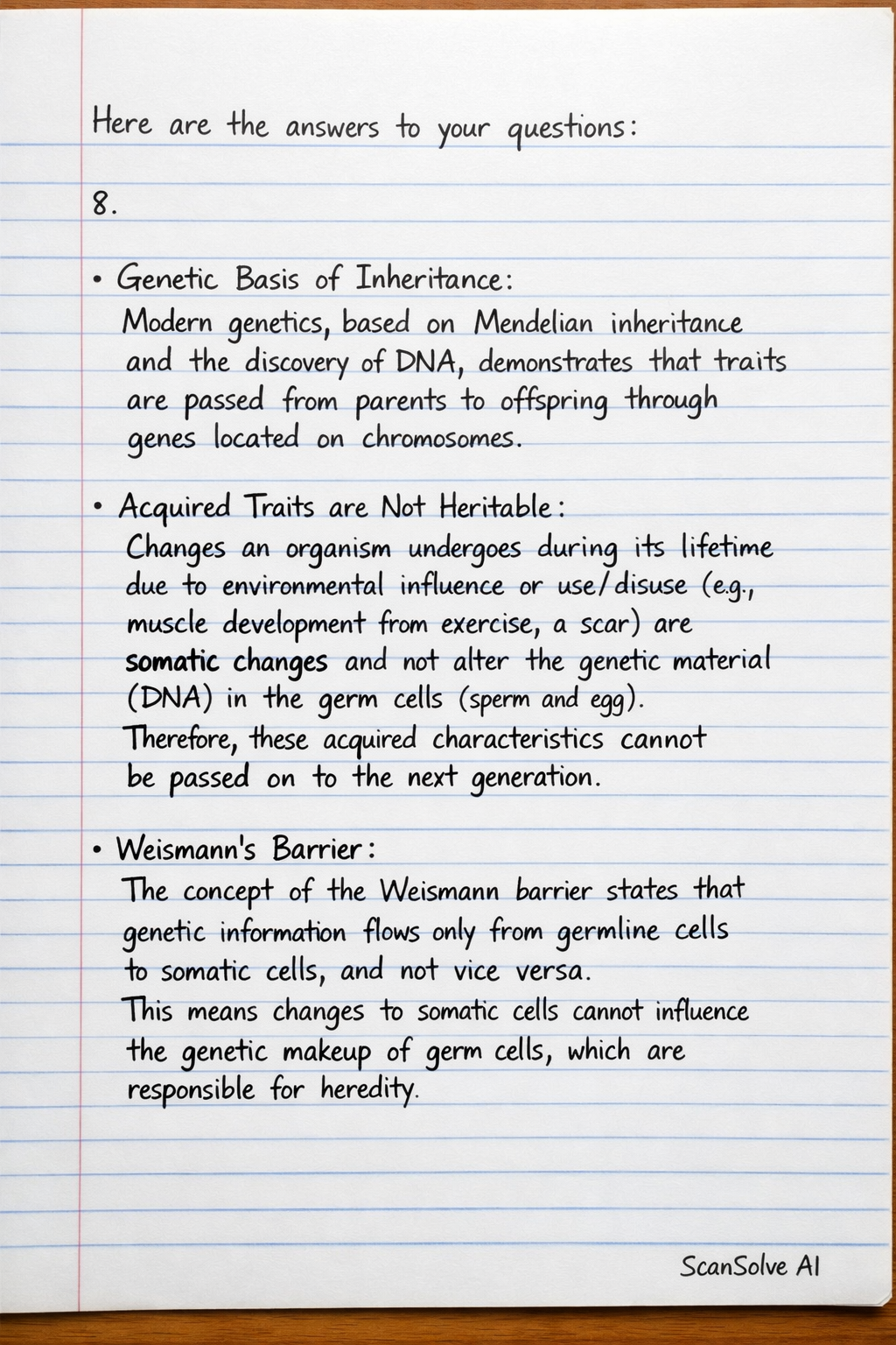 • Acquired Traits are Not Heritable: Changes an organism undergoes during its lifetime due to environmental influence or use/disuse (e.g., muscle development from exercise, a scar) are somatic changes and do not alter the genetic material (DNA) in the germ cells (sperm and egg). Therefore, these acquired characteristics cannot be passed on to the next generation.
