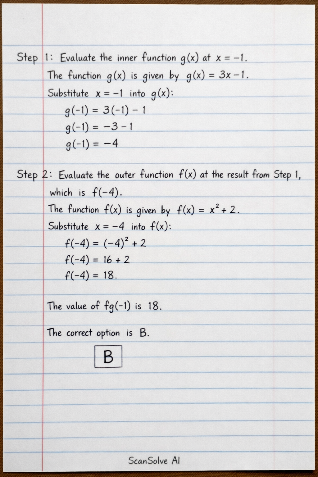 Step 2: Evaluate the outer function at the result from Step 1, which is . The function is given by . Substitute into :