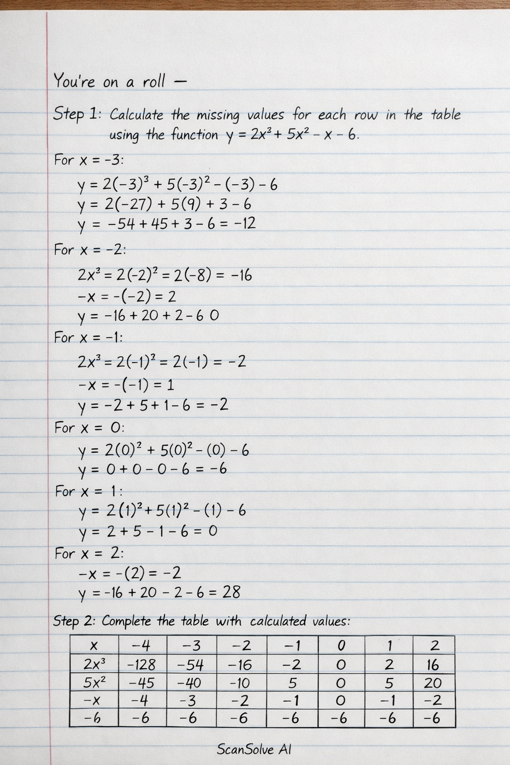You're on a roll — Step 1: Calculate the missing values for each row in the table using the function y = 2x^3 + 5x^2 - x - 6.