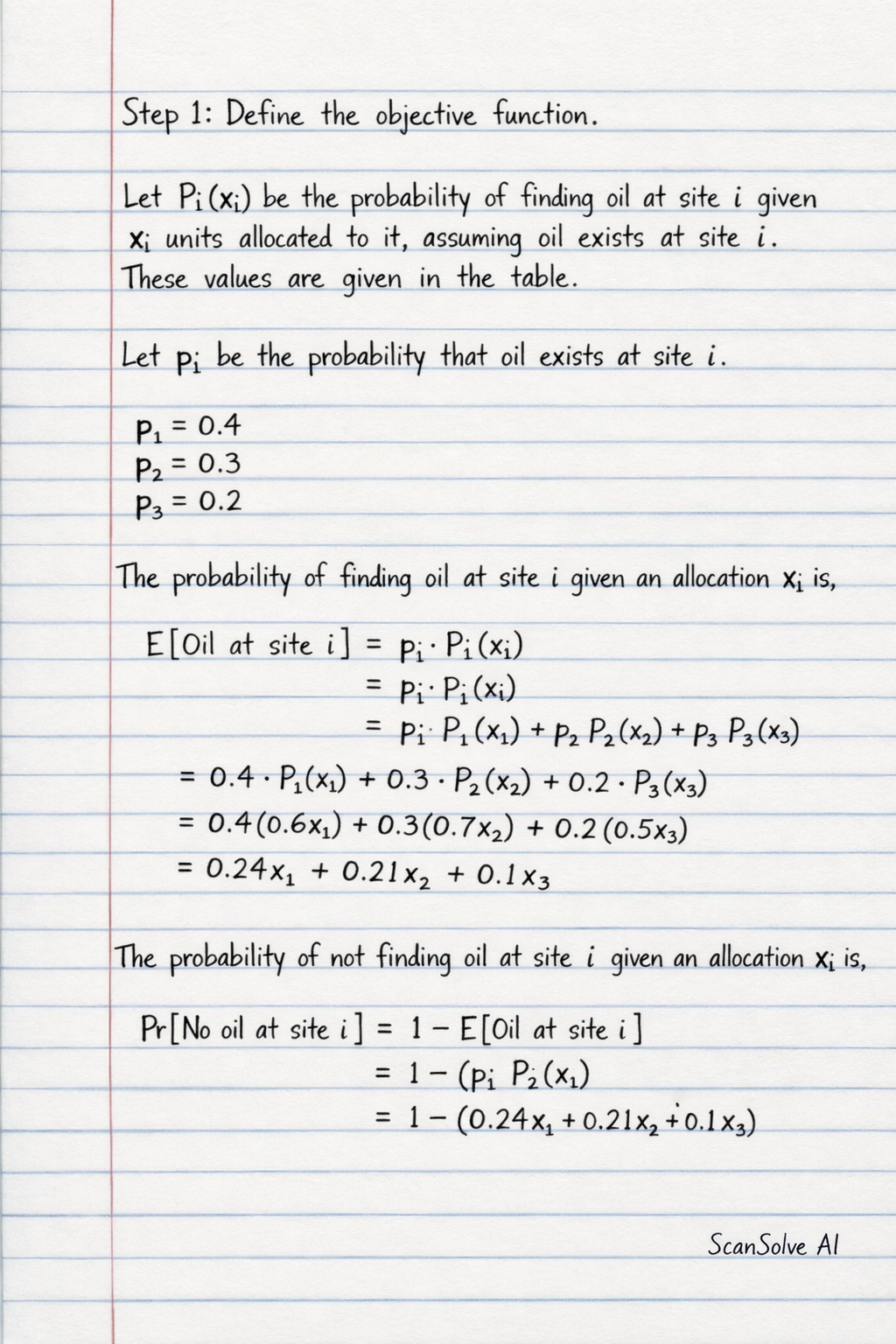 Step 1: Define the objective function. Let be the probability of finding oil at site given units of money are allocated to it, assuming oil exists at site . These values are given in the table. Let be the probability that oil exists at site .
