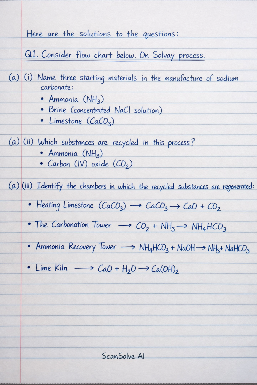 Here are the solutions to the questions: Q1. Consider flow chart below. On solvay process a) (i) Name three starting materials in the manufacturer of sodium carbonate. Ammonia* (NH_3) Brine* (concentrated NaCl solution) Limestone* (CaCO_3) a) (ii) Which substances are recycled in this process? Ammonia* (NH_3) Carbon (IV) oxide* (CO_2) a) (iii) Identify the chambers in which the recycled substances are regenerated. Heating Limestone* (for