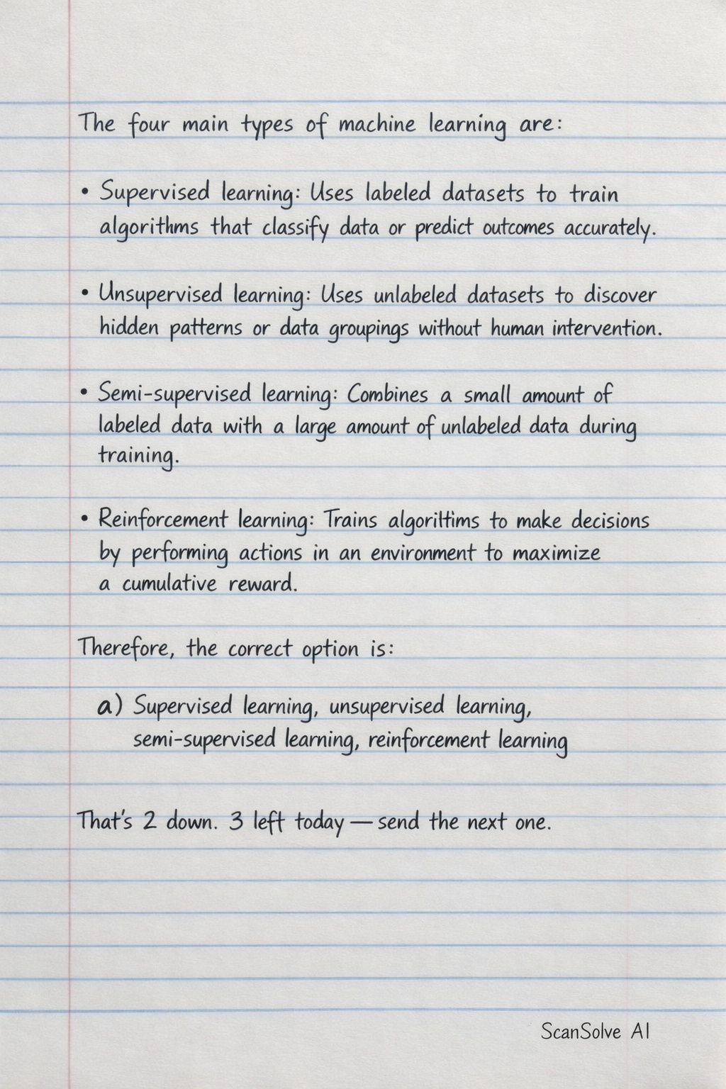 a) Supervised learning, unsupervised learning, semi-supervised learning, reinforcement learning