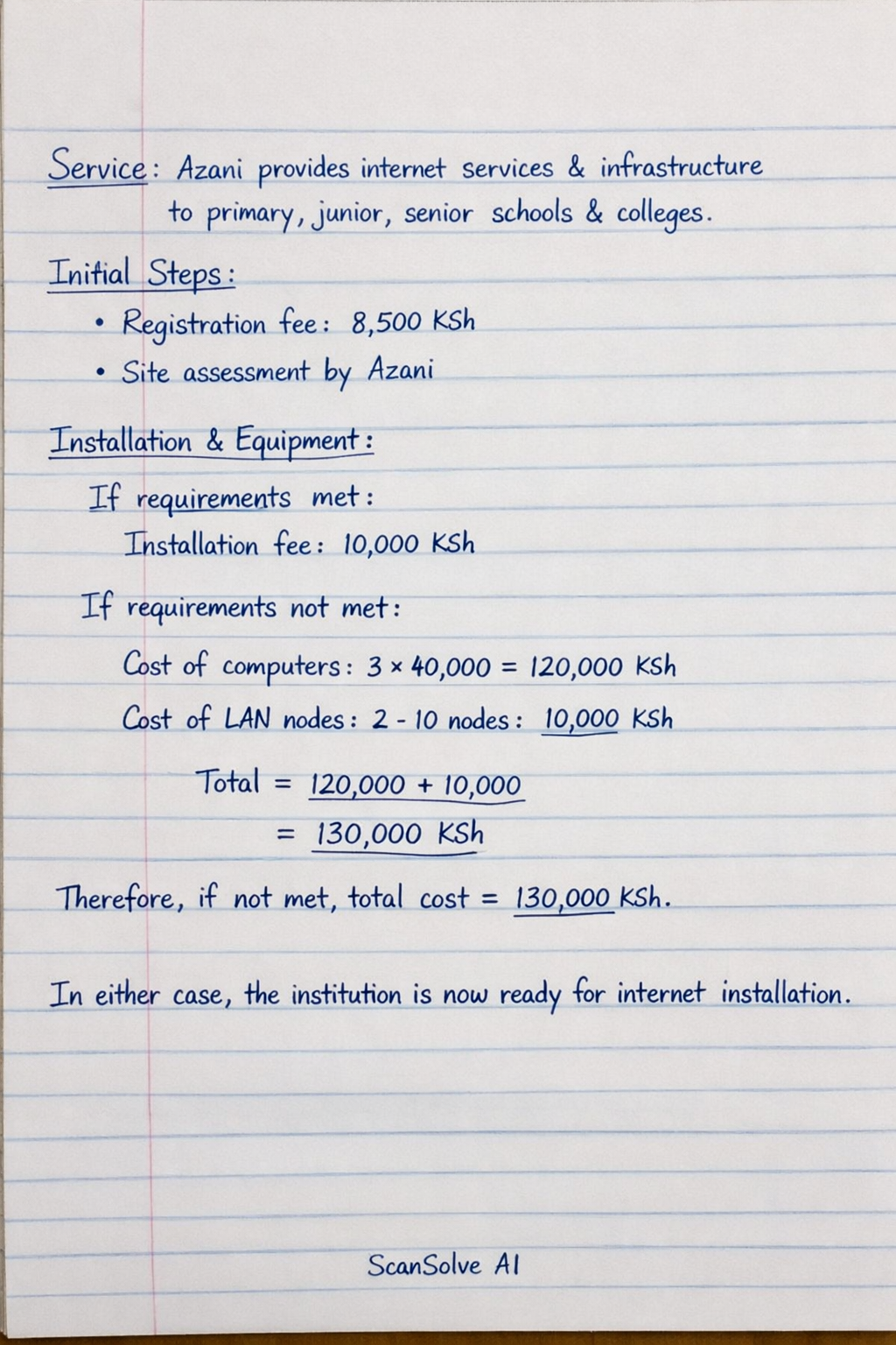 Azani visits the institution's site to assess its readiness for internet installation, checking for sufficient computers and Local Area Network (LAN) infrastructure.