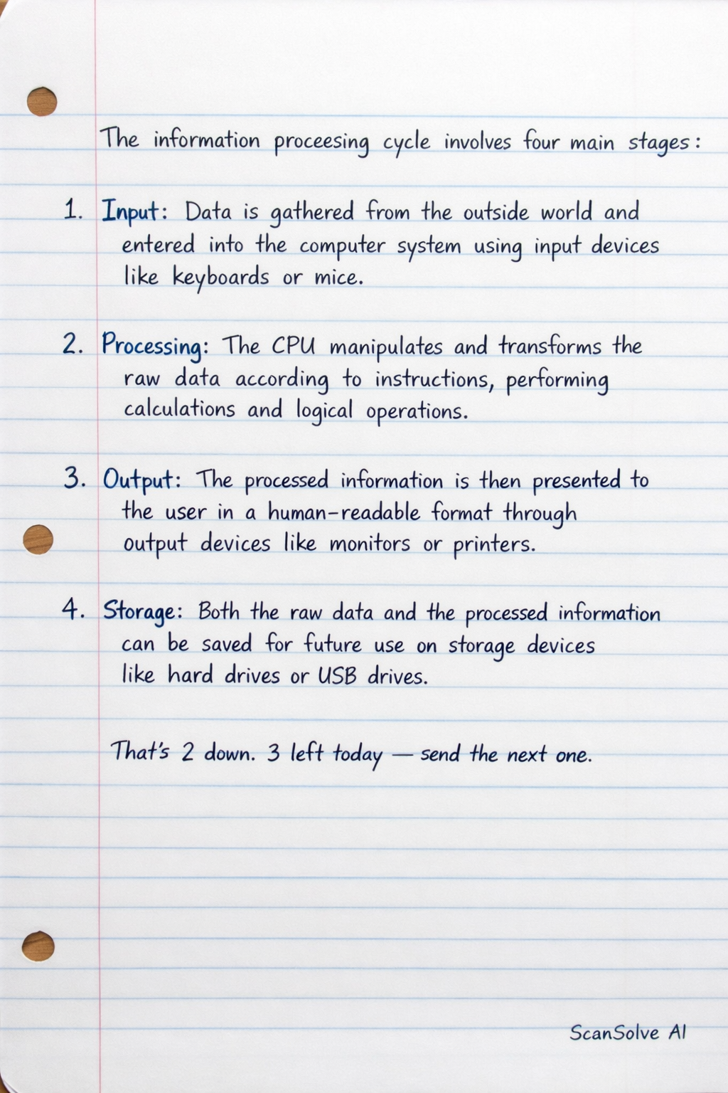 The information processing cycle describes the sequence of events that a computer follows to transform raw data into meaningful information. It typically involves four main stages:
