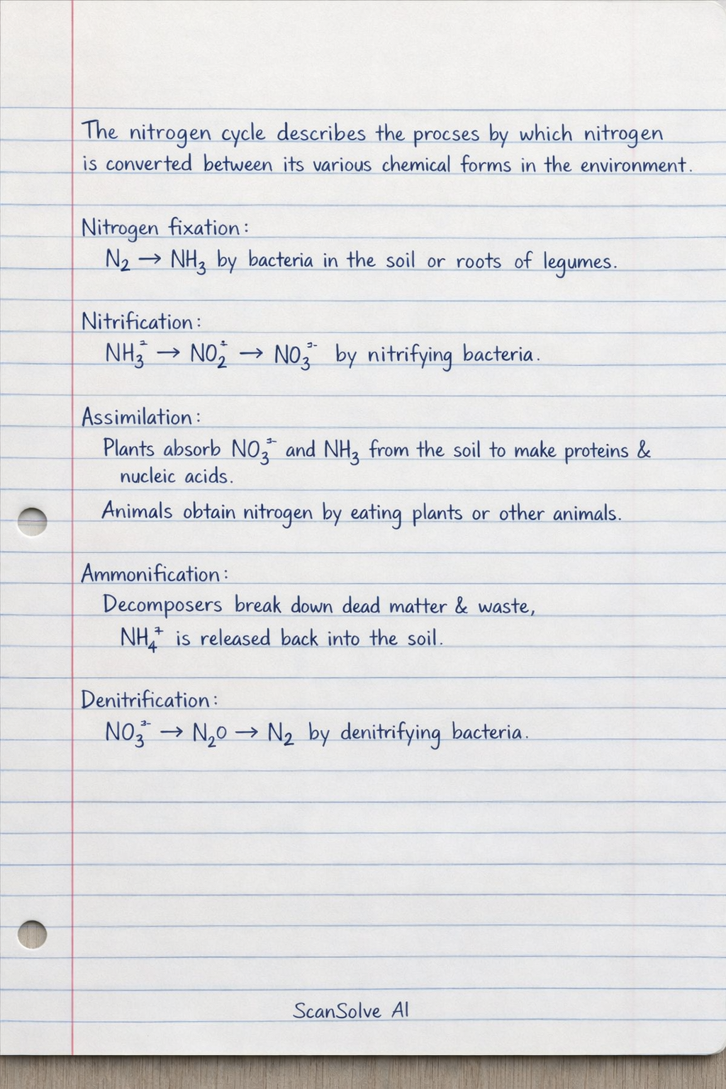 • Nitrogen fixation: Atmospheric nitrogen (N2) is converted into ammonia (NH3) by bacteria in the soil or roots of legumes.