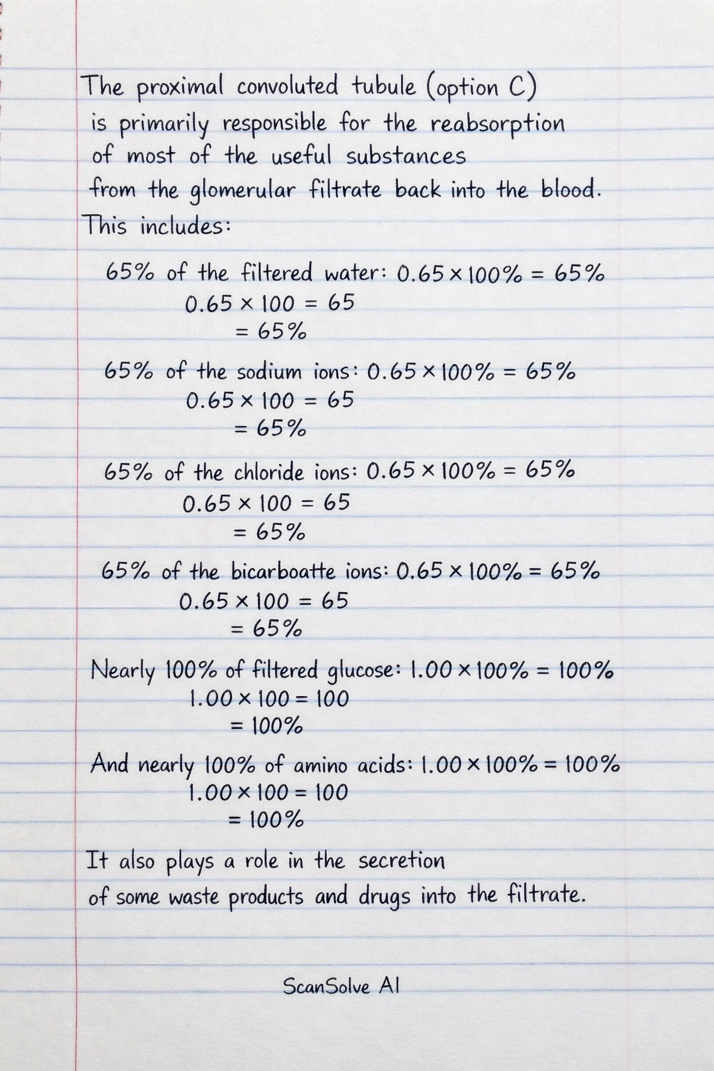 The proximal convoluted tubule (option C) is primarily responsible for the reabsorption of most of the useful substances from the glomerular filtrate back into the blood. This includes about 65% of the filtered water, sodium ions, chloride ions, bicarbonate ions, and nearly 100% of filtered glucose and amino acids. It also plays a role in the secretion of some waste products and drugs into the filtrate.