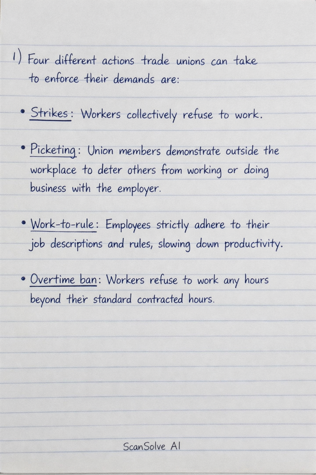 1) Four different actions trade unions can take to enforce their demands are: