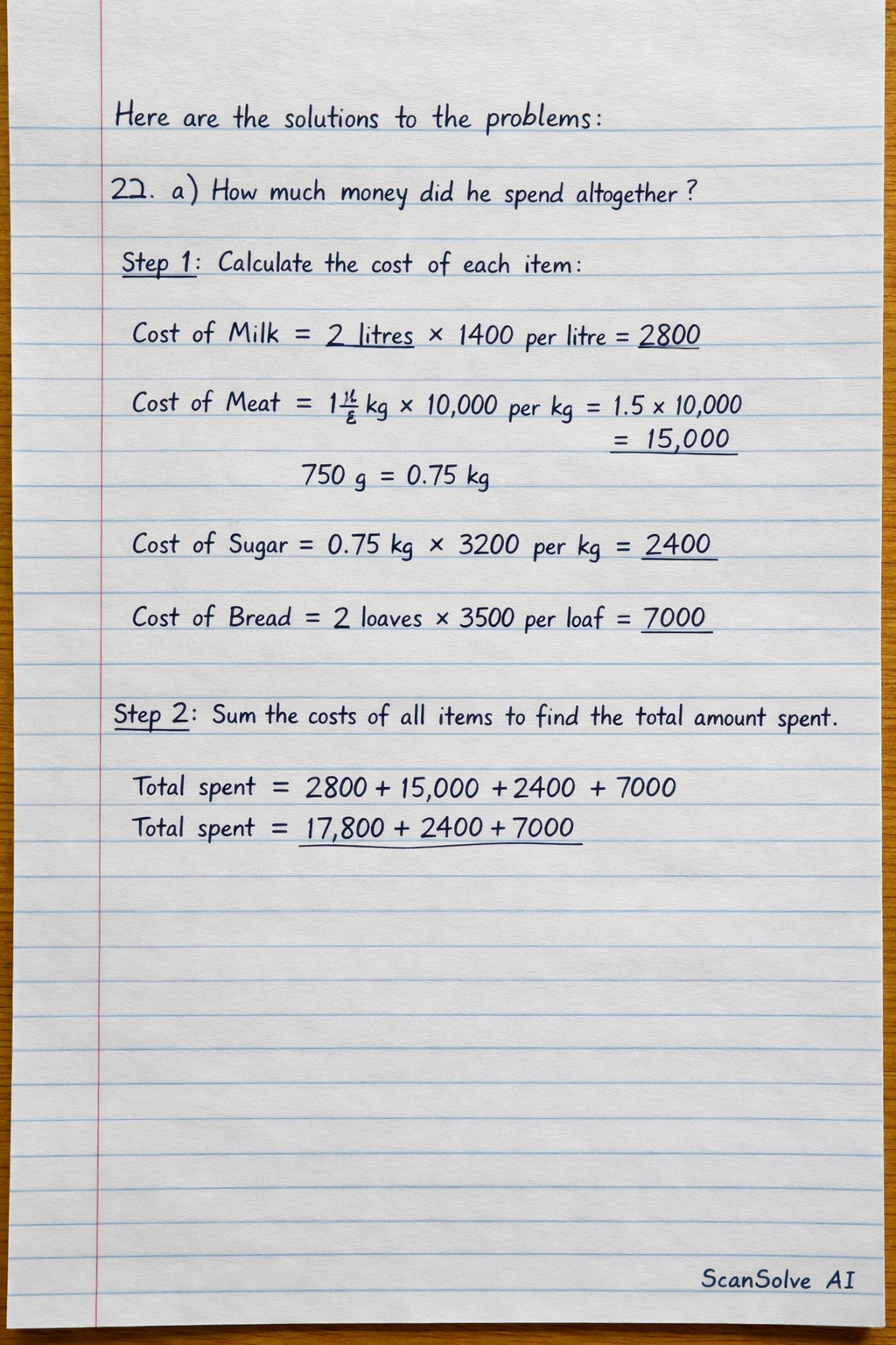 a) How much money did he spend altogether? Step 1: Calculate the cost of each item. • Milk: • Meat: • Sugar: Convert grams to kilograms: • Bread: Step 2: Sum the costs of all items to find the total amount spent. He spent altogether.